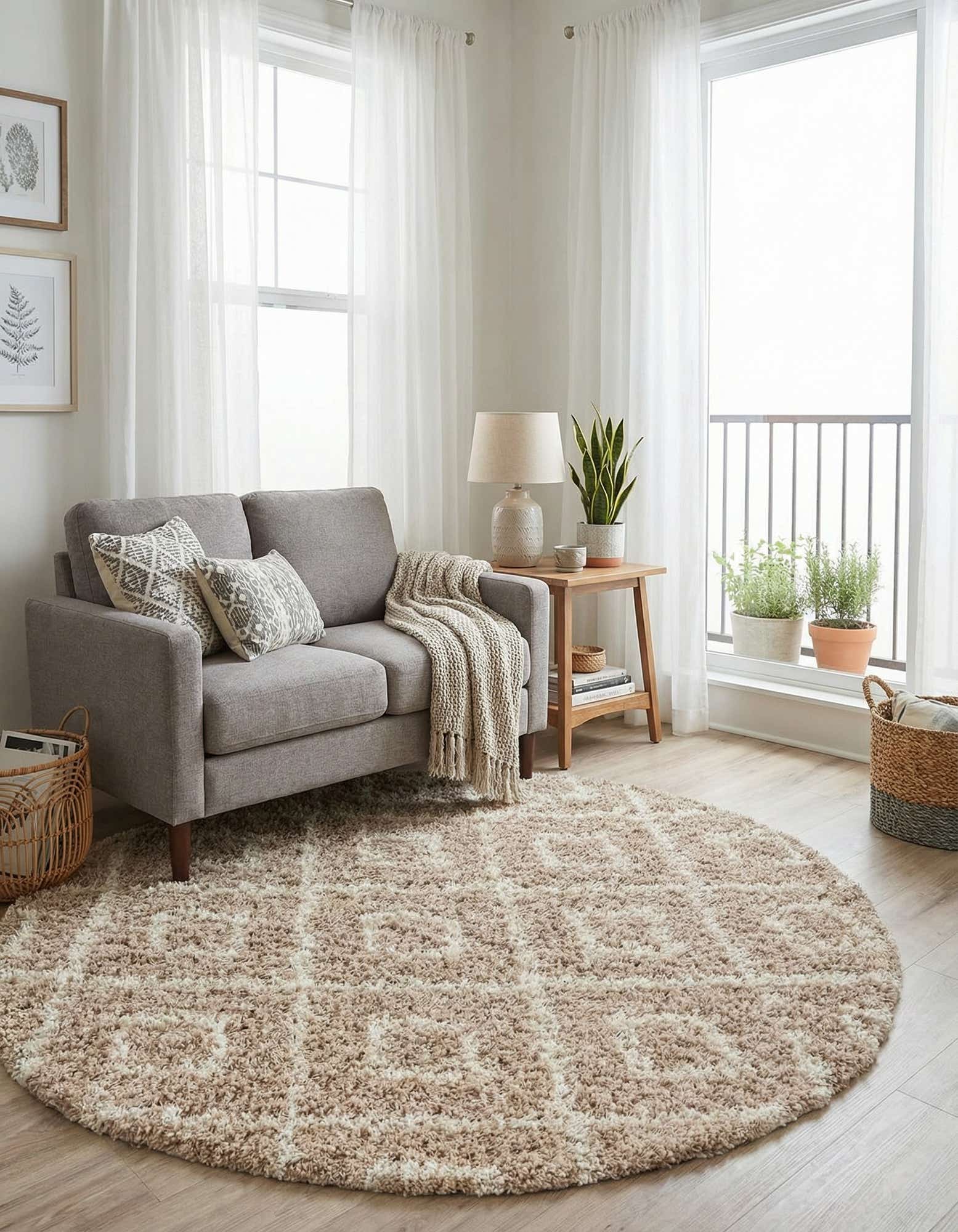 Pair this round rug with natural wood furniture and linen upholstery for a modern farmhouse or transitional living room, or place it beneath a cozy reading chair to create a defined nook with tactile comfort. Its neutral palette also complements Scandinavian and casual coastal schemes—use it to warm a bedroom bedside, anchor a small breakfast nook, or soften a home office seating area.