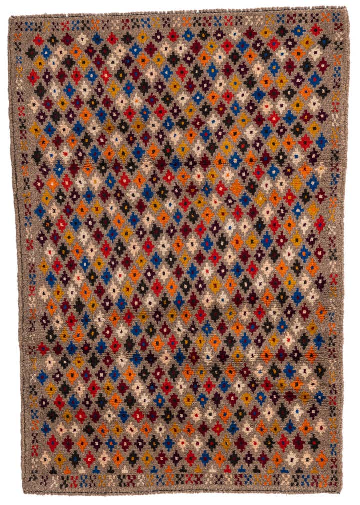 A compact tribal rug patterned with tightly arranged geometric lozenges across a light brown field. Repeated diamond motifs in blue, orange, red and deeper brown create a rhythmic, handcrafted look that retains clarity without overwhelming the eye. Hand-knotted in 100% wool, the pile has a warm, slightly springy hand and a low-to-medium profile that cushions underfoot while keeping the pattern crisp and tactile.