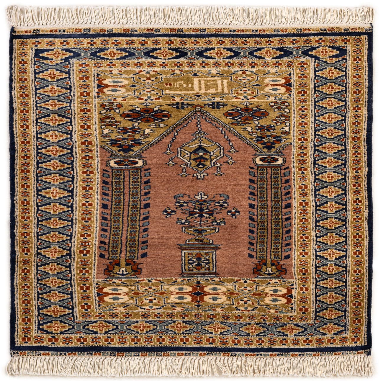 A 3x4 rectangular Bokhara rug with a traditional tribal pattern in browns, tans, and blues, featuring a central mihrab design and intricate borders, suitable for indoor spaces.