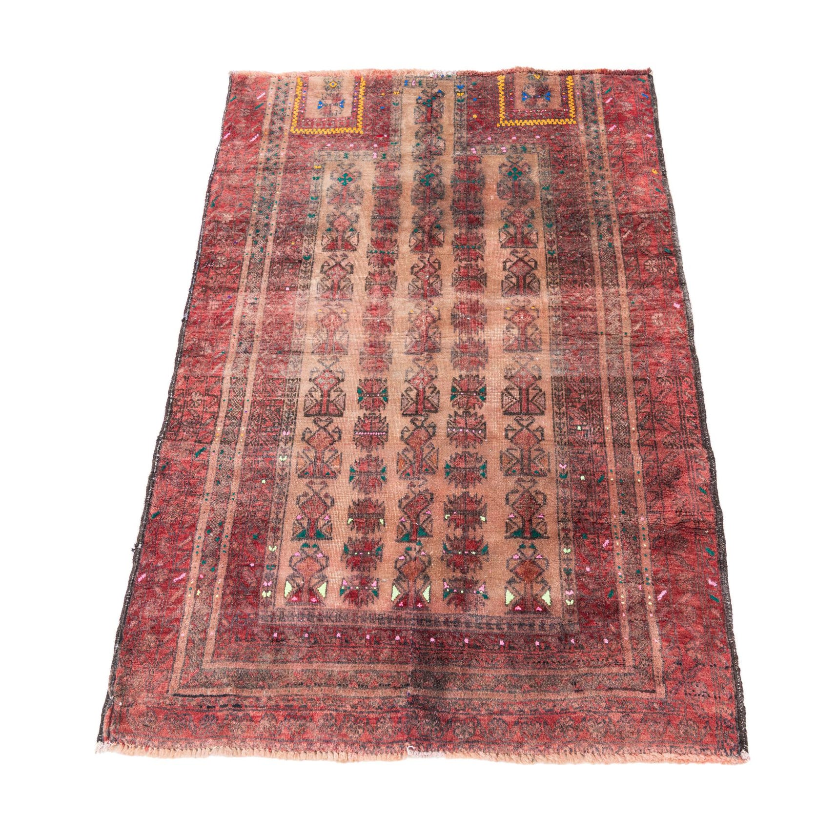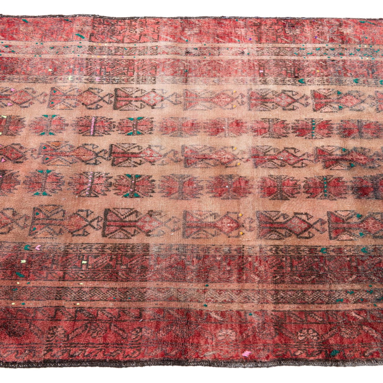 Primary color is Light Brown. Colors in this rug include: Light Brown, Brown, Green, Olive, Red, Pink.