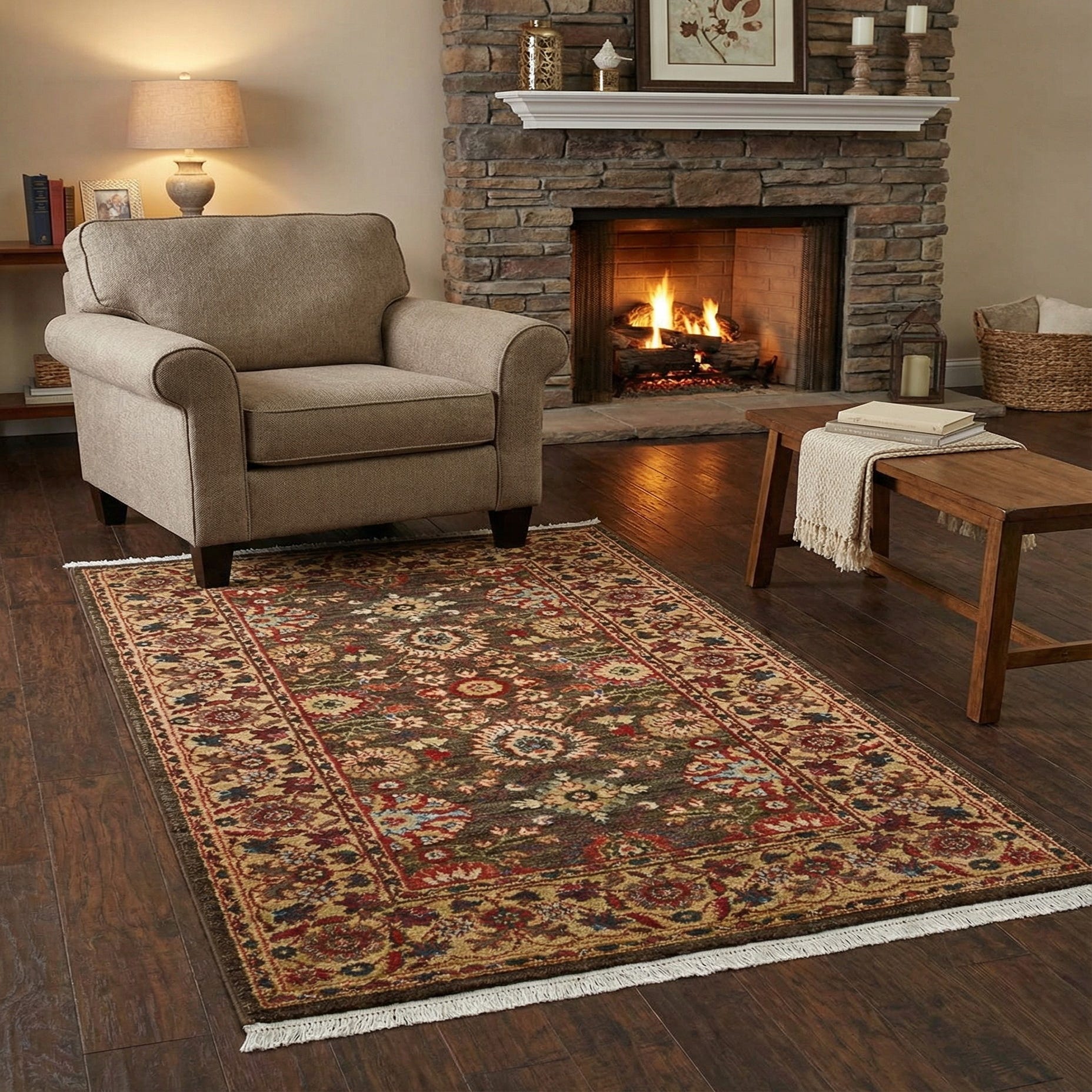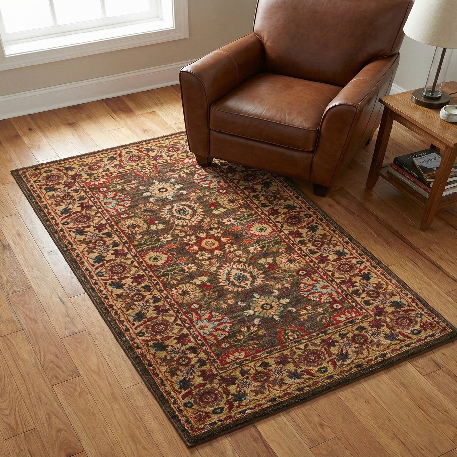 Machine made from 100% polypropylene, the rug has a tightly woven surface that feels soft to the touch and offers a subtle, cushioned underfoot feel. Its scale and palette are well-suited to entryways, hallways or a compact seating area, and it pairs naturally with warm wood tones, neutral upholstery, or traditional and transitional interiors seeking a grounded, layered look.