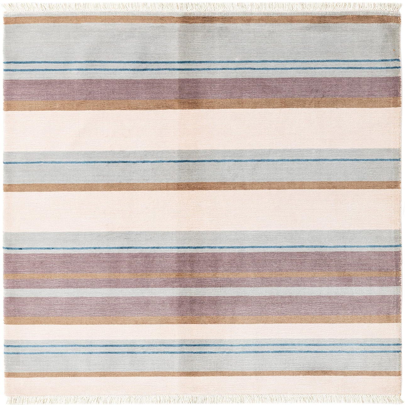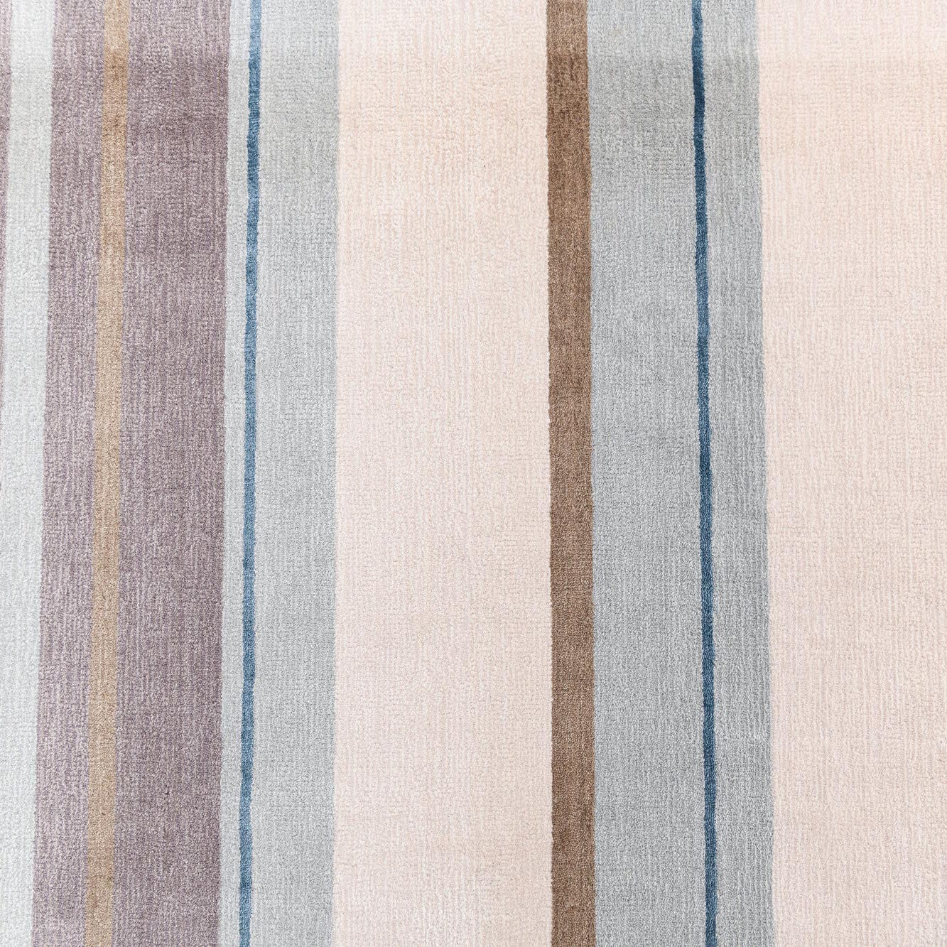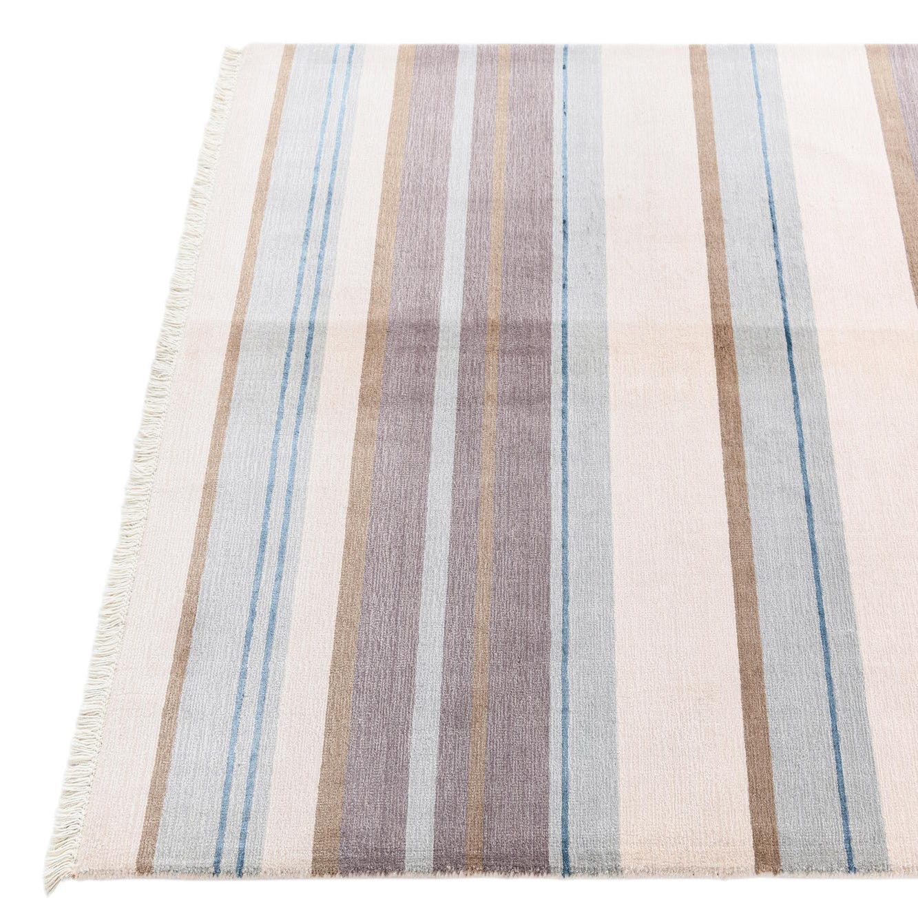A 3x5 rectangular Darya rug featuring modern horizontal stripes in varying shades of brown, tan, light blue, and muted purple, with fringe.