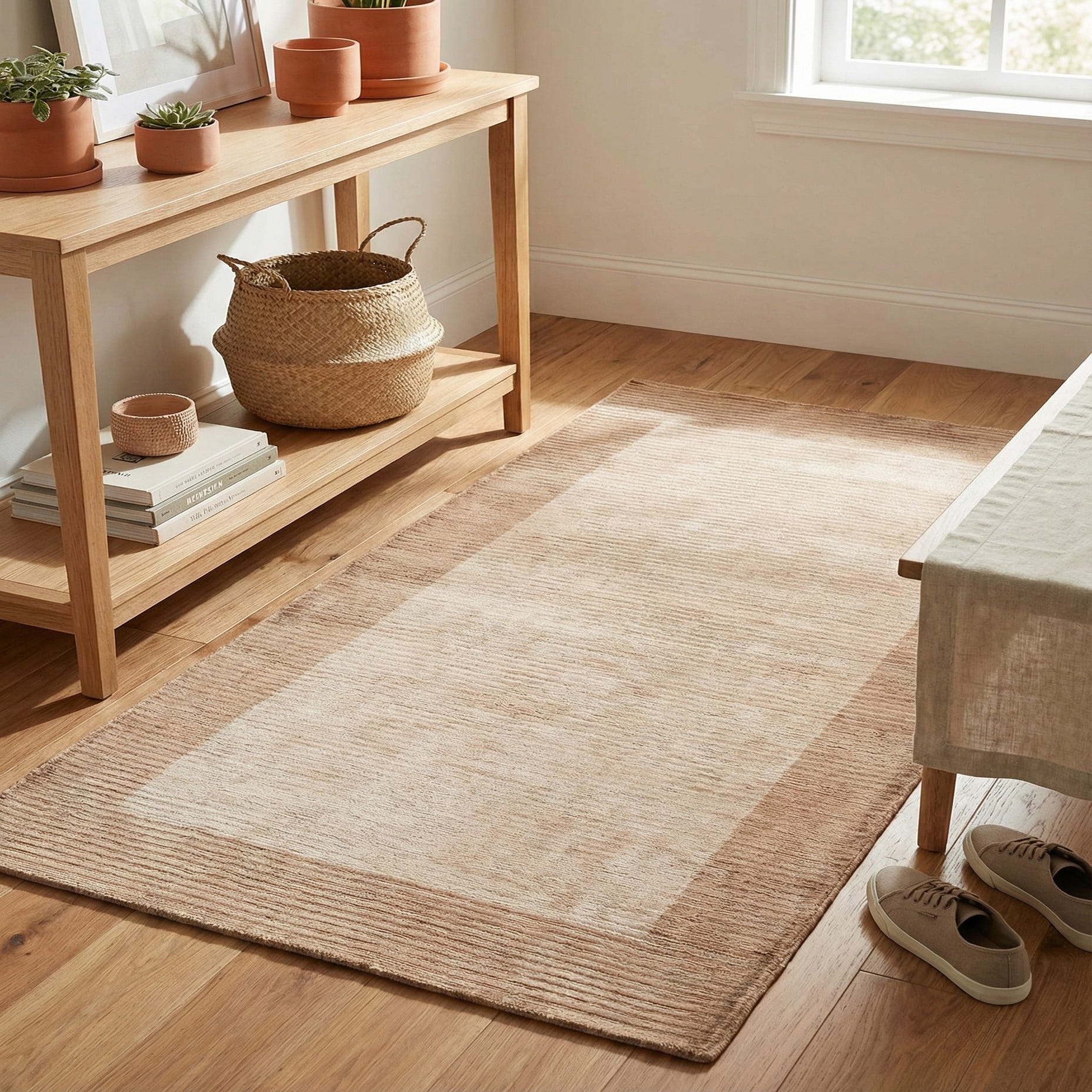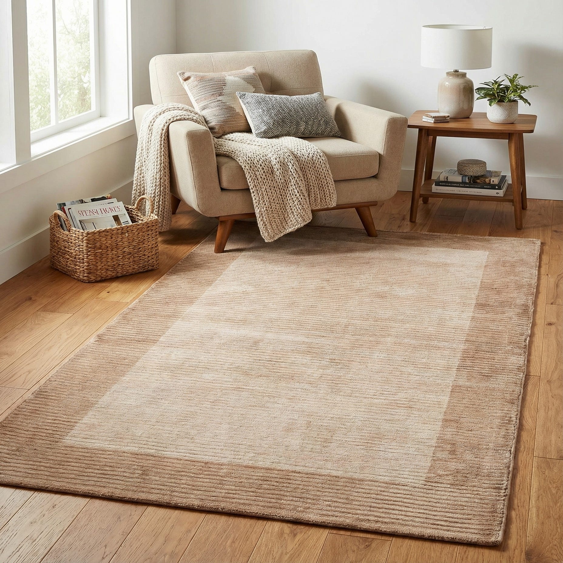 The Darya collection presents a 3x5 hand-knotted rug crafted from 100% wool, offering natural durability and a soft texture underfoot. This particular rug showcases a simple yet sophisticated pattern with a light brown background accented by deeper brown borders. The design's minimalist aesthetic lends itself to a wide range of interior settings.