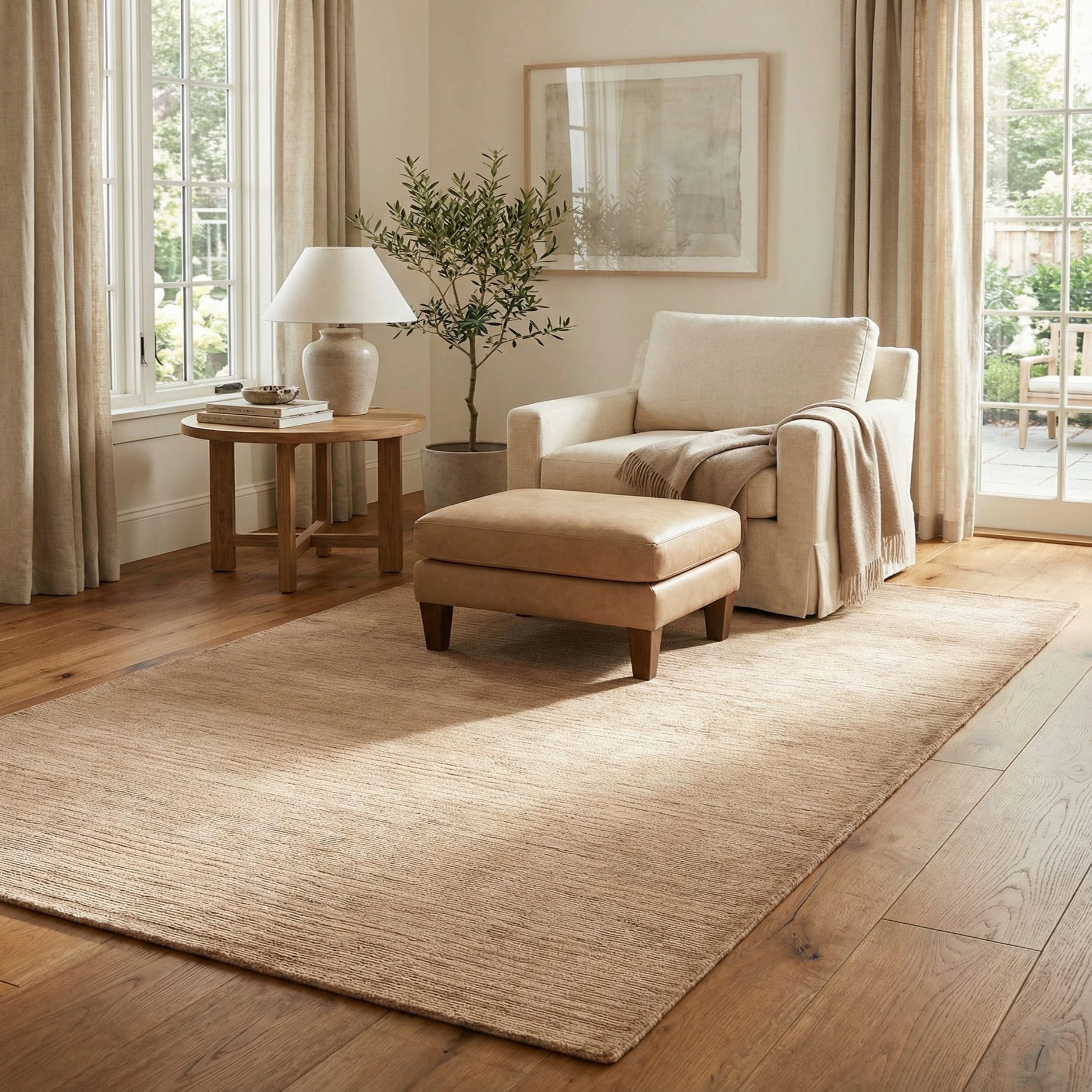 This rug's minimalist approach and clean design make it an ideal choice for contemporary settings, Scandinavian-inspired decor, or any space where simplicity and natural tones are valued. Its understated elegance allows it to serve as a foundational piece in a living room, study, or bedroom, complementing both bold and subdued color schemes while harmonizing with various furniture styles.