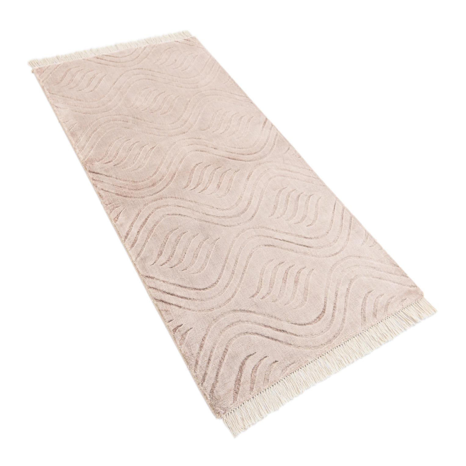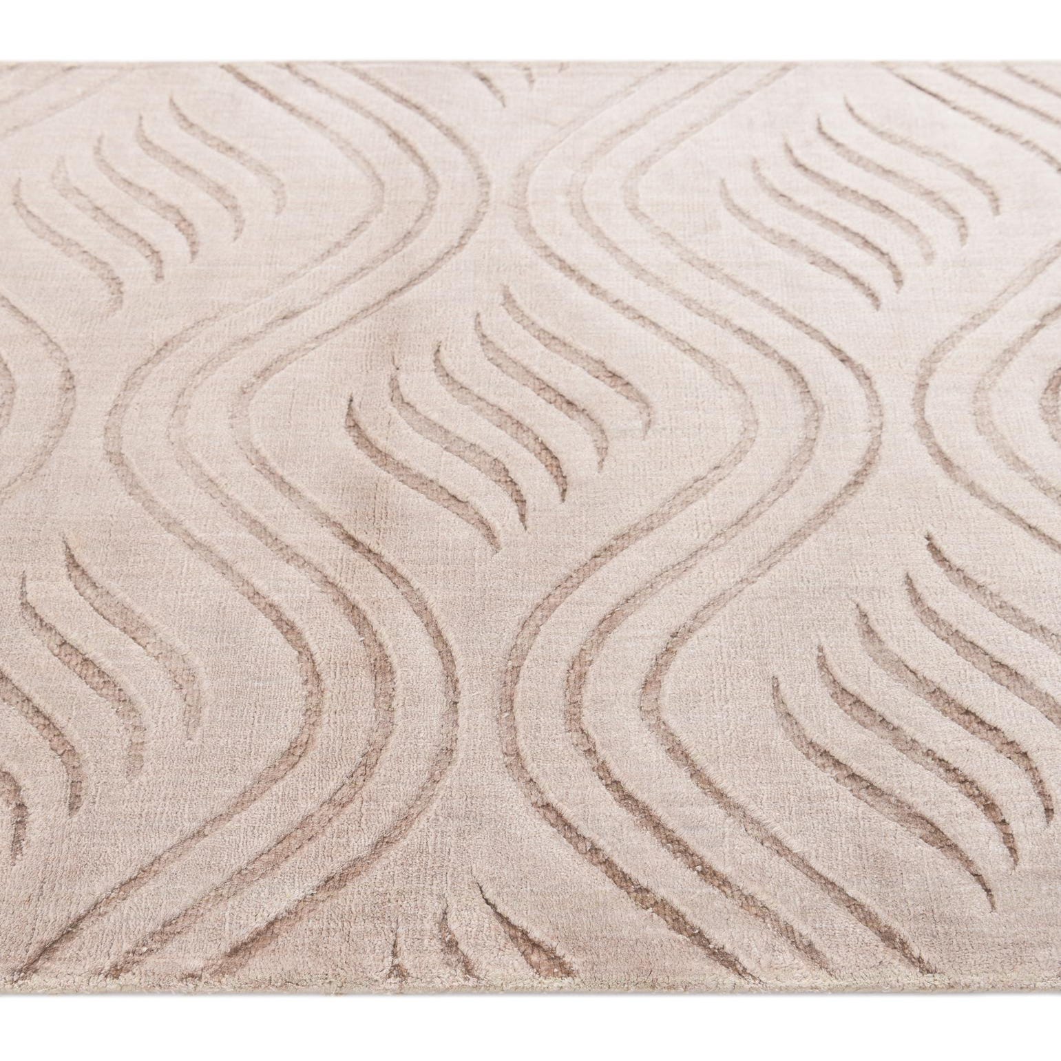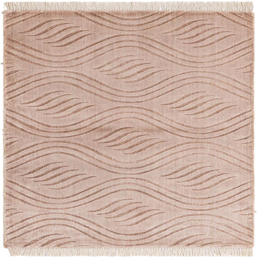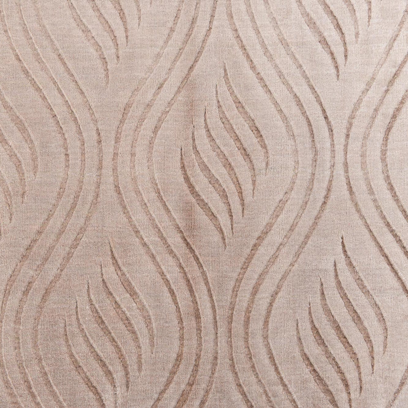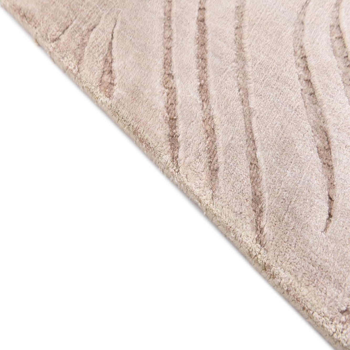 A hand-knotted 100% wool rug with a light brown ground and a low, plush pile that invites bare feet. A carved, wave-like motif in tan and terracotta flows across the surface, creating subtle depth and a gentle, tactile contrast between the raised pattern and the smoother background. The short fringe at each end adds a casual, finished touch while the carved lines catch light and cast soft shadows for added dimension.