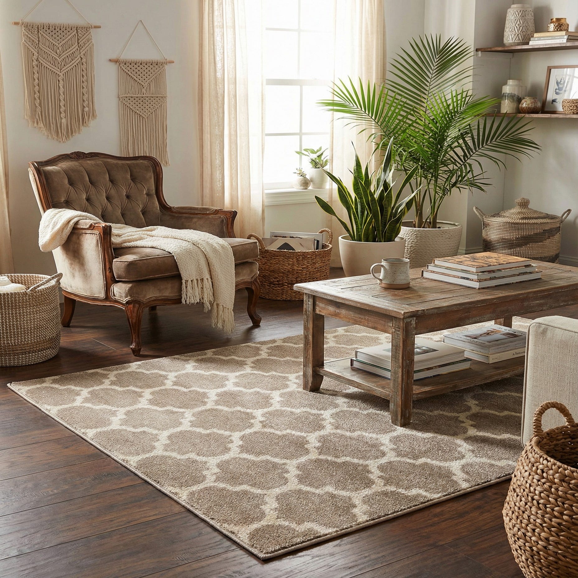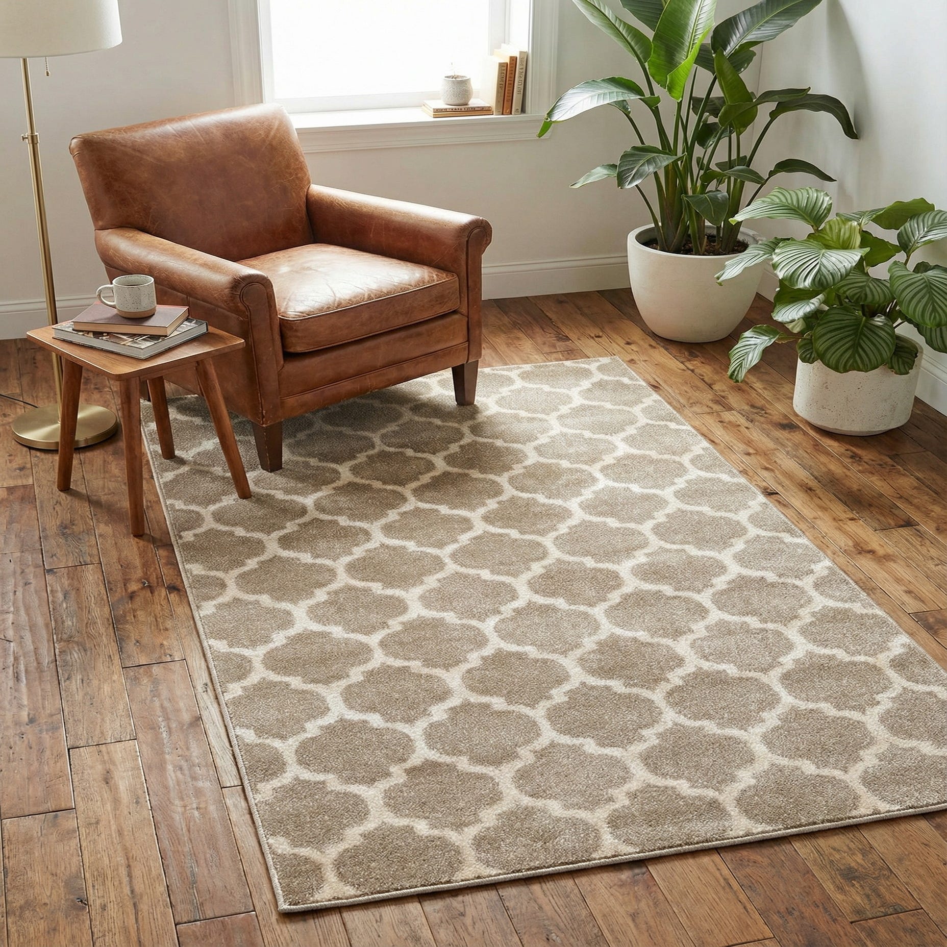 A subtle geometric trellis pattern in soft beige runs across a light brown field, creating a calm, structured look that balances traditional and modern sensibilities. The surface is machine-made from 100% polypropylene with a low, even pile that feels smooth underfoot—there’s a slight cushion when you walk on it and the fibers lie consistently to reveal the pattern clearly. The repeating motif has a gently rounded quatrefoil shape that gives the rug rhythm without overpowering a room.