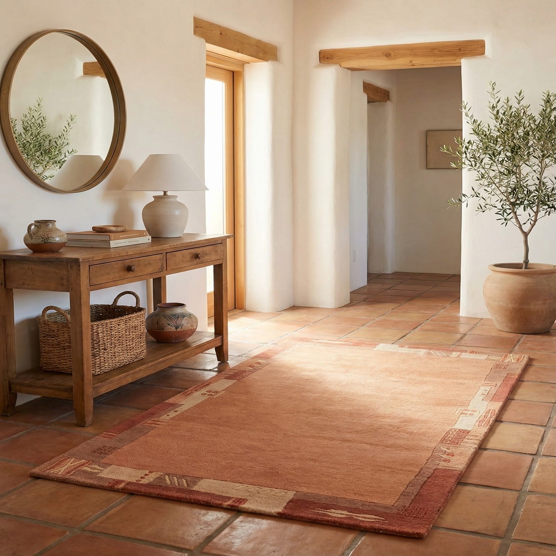 The wool pile is soft to the touch with a pleasantly dense, slightly resilient feel underfoot; hand-knotting lends gentle variations in texture and tone that read as authentic and comfortable. This piece works well in smaller layouts — place it at the foot of a bed, in front of a sofa in a compact living area, beside an armchair in a reading nook, or under a small desk in a home office. The light brown background and rust accents pair naturally with warm woods, leather seating, neutral upholstery, and mid-century or transitional interiors.