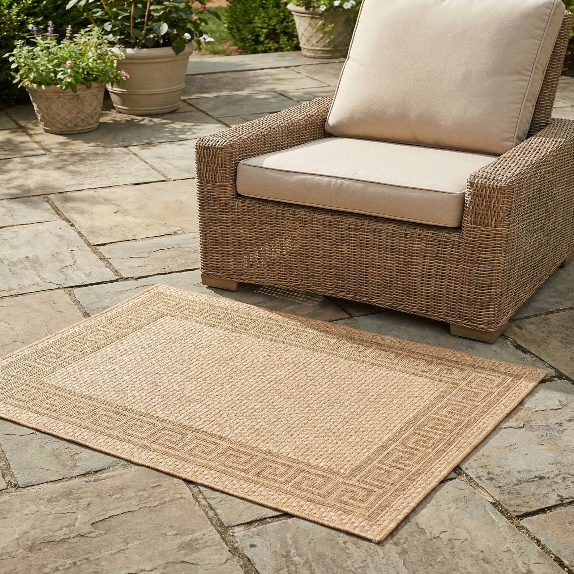 This rug works well on a covered patio or screened porch, layered beneath a small outdoor dining set or lounge grouping, and it also fits neatly in transitional entryways, mudrooms, or kitchens where a low-profile floor covering is preferred. Pair it with wicker or teak furniture and neutral linens for a relaxed, coastal or Mediterranean vibe, or use it to ground a casual living area with warm wood tones and textured accents.