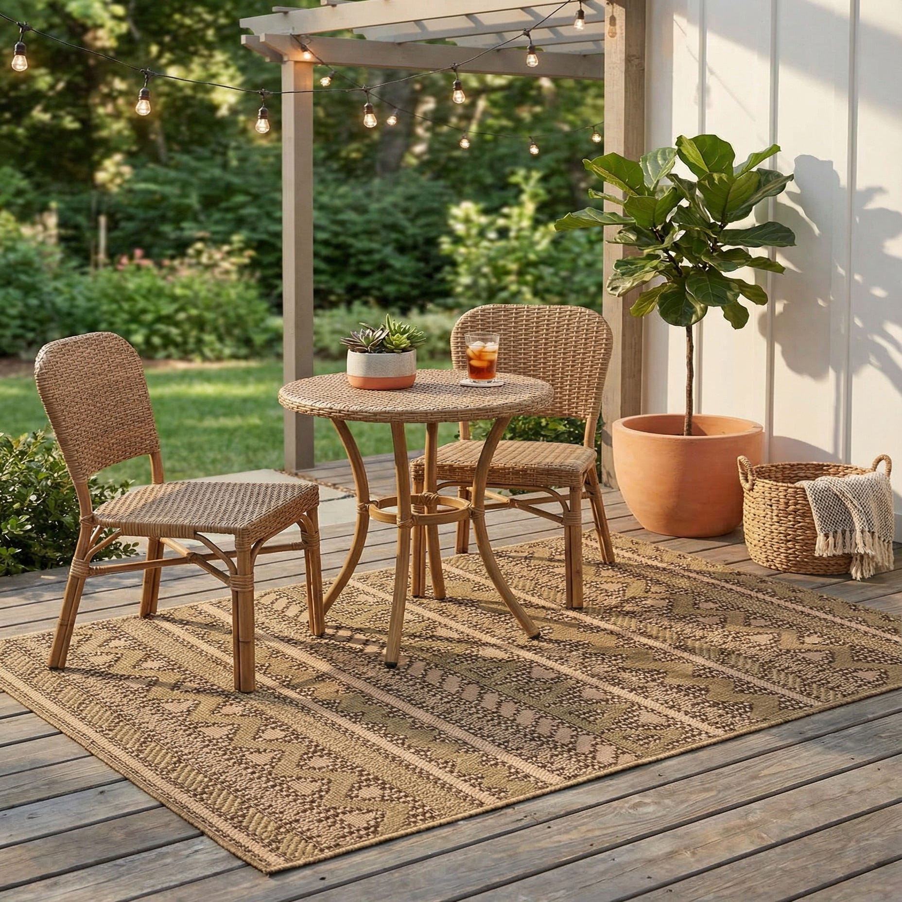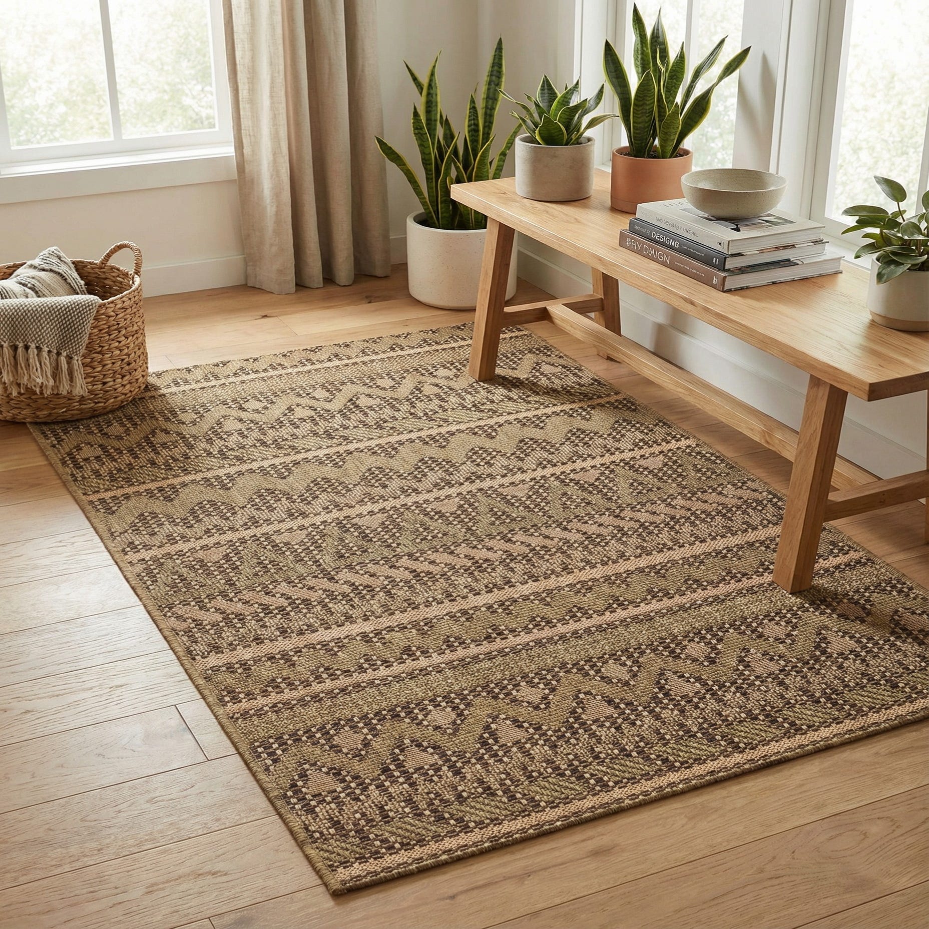 The colorway and linear pattern work well in casual, contemporary settings: place it by a bistro set on a covered patio, layer it in a sunroom with rattan pieces, or anchor an entryway or kitchen with warm-toned wood and metal accents. It pairs naturally with neutral upholstery, leather seating, or woven textiles and complements interiors leaning rustic, coastal, or modern-farmhouse without overpowering other finishes.