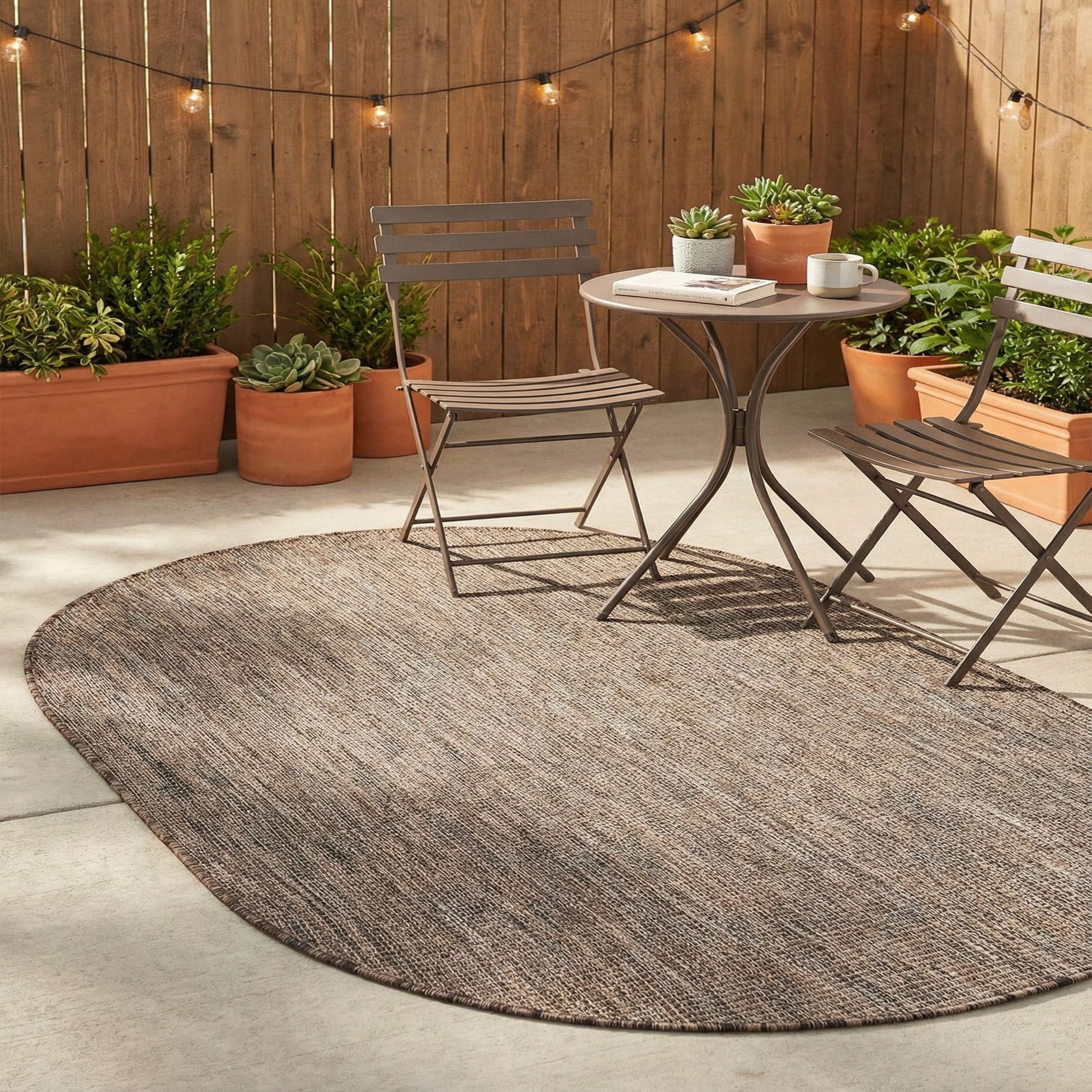The neutral palette and understated pattern suit a range of casual settings. Place it on a covered patio or balcony under a bistro or lounge grouping, use it in a sunroom or kitchen for a grounded, easygoing foundation, or tuck it into an entryway or mudroom to soften hard lines. Its oval silhouette pairs well with round tables and curved furniture and complements modern farmhouse, coastal, or industrial-inspired outdoor and transitional interiors.