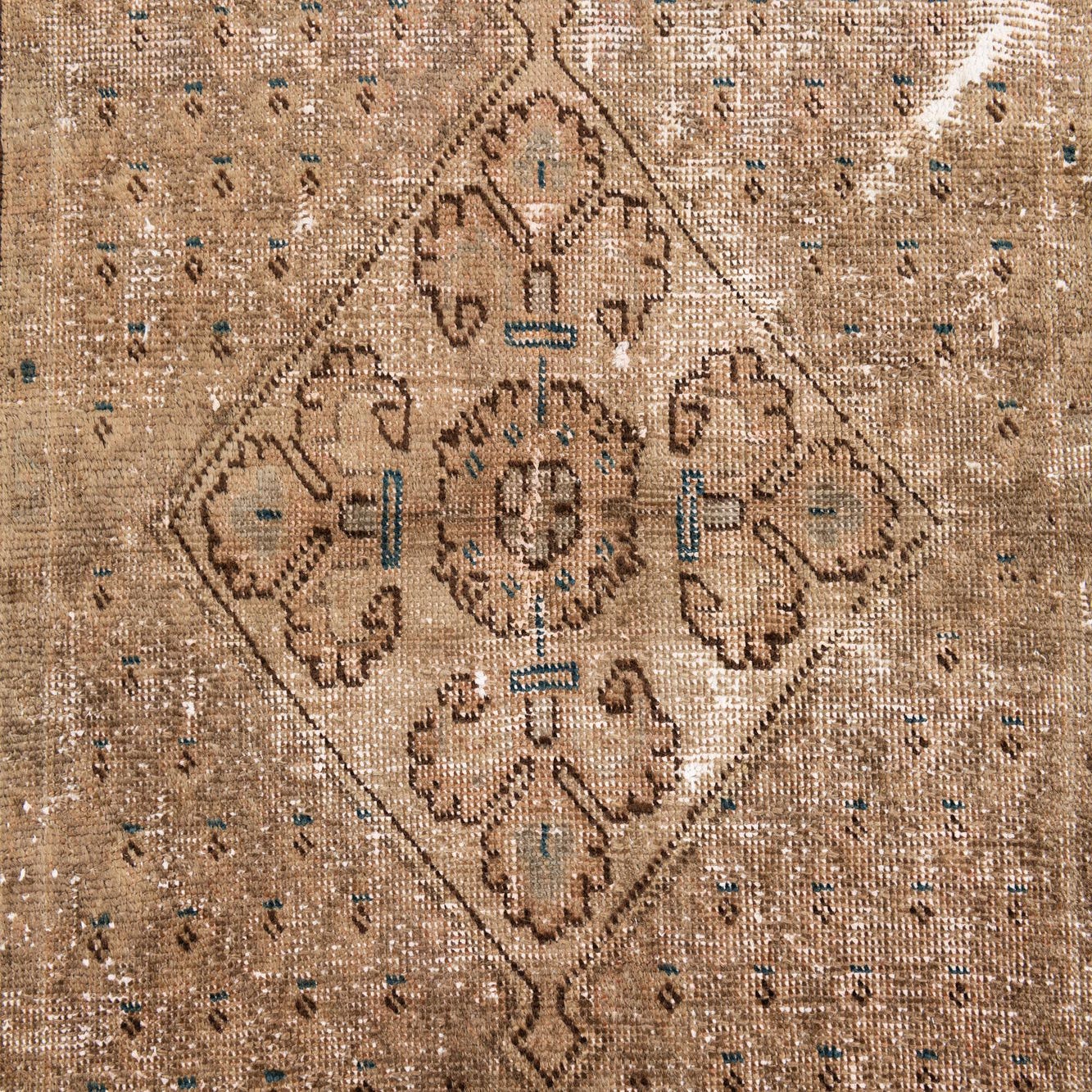 A 3x5 rectangular brown and tan Persian-style wool rug with a faded medallion pattern and distressed finish.
