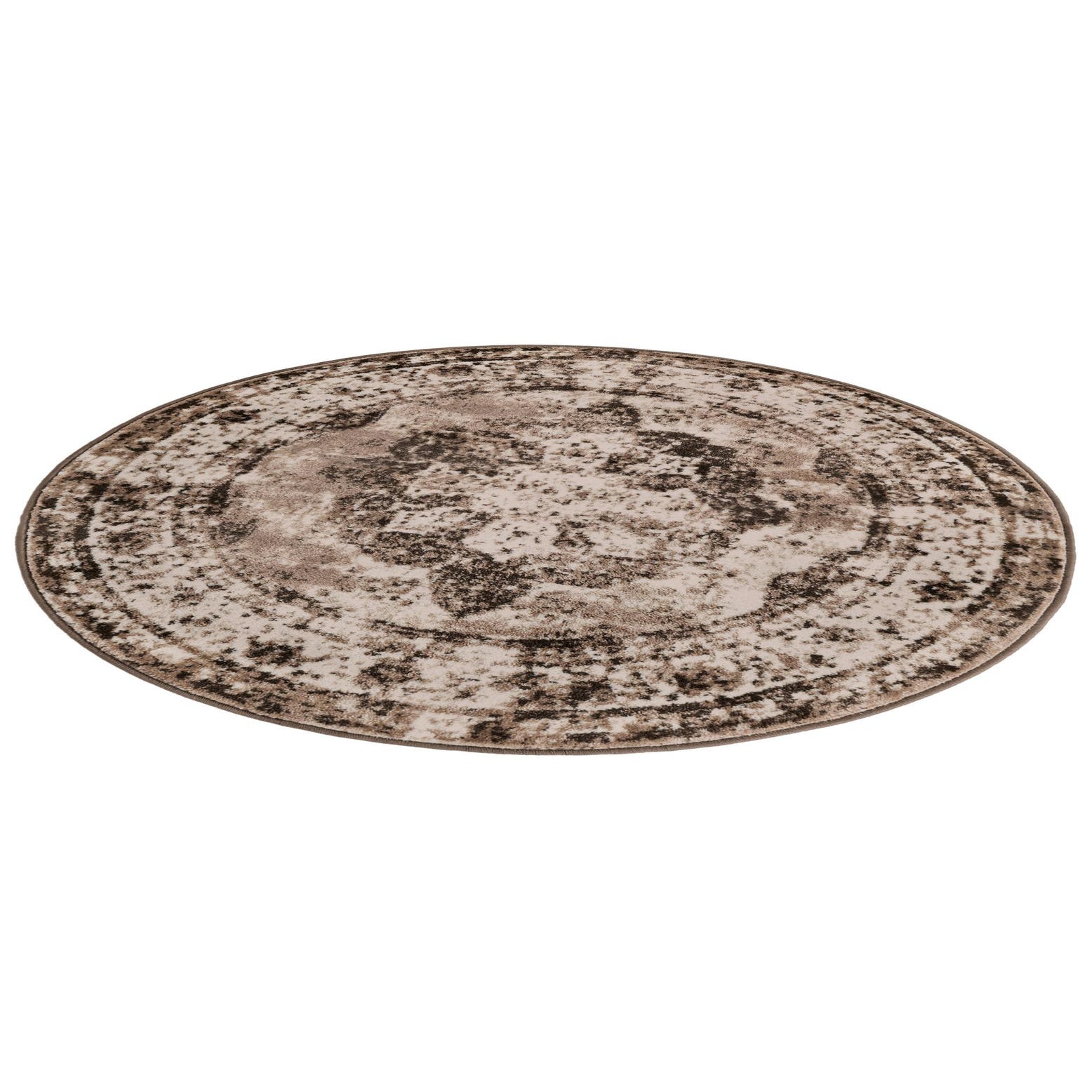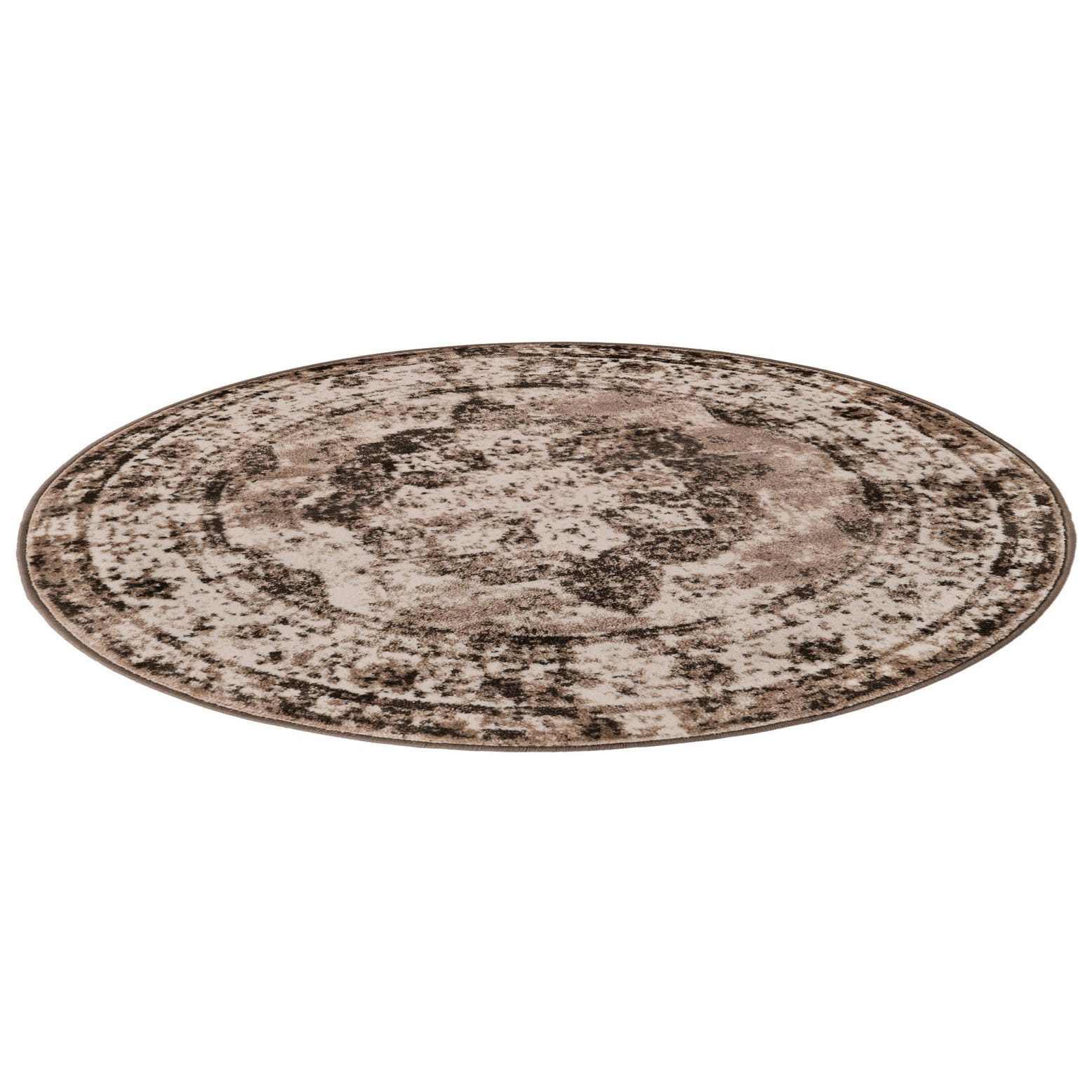 This Monte Carlo collection rug features an artfully distressed pattern, offering a modern interpretation of classic design elements. The colors incorporated in this 4 Ft Round rug include a light brown background with complementary shades of brown and ivory details, resulting in a harmonious color palette that can integrate seamlessly into various interior design themes.
