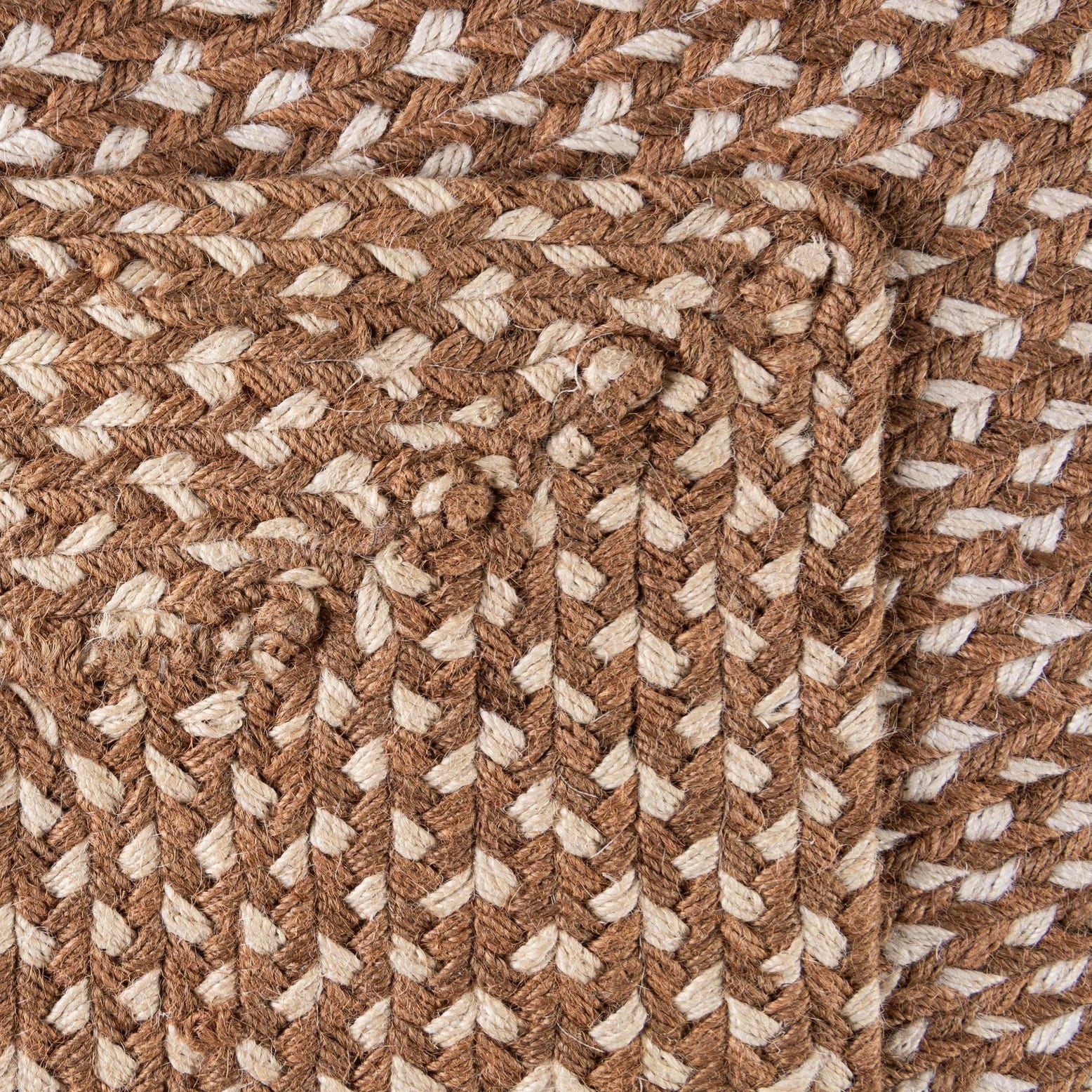 Hand-braided of 100% jute, this runner has a warm light brown background woven with strands of ivory and gray for a subtle tweed effect. Tightly plaited rows create linear columns that shift at the edges into a framed, rectangular braid, producing a soft chevron-like rhythm across the surface. The natural jute fibers give a textured, tactile feel—firm with a bit of spring—while the braided construction adds depth and visual interest underfoot.