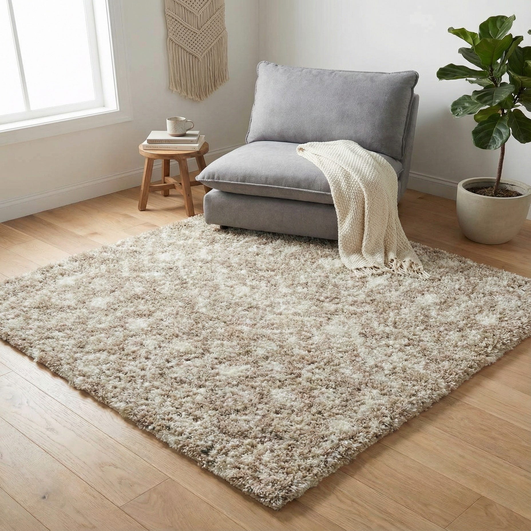 A plush, high-pile shag with a light brown ground and an ivory Moroccan trellis motif, this rug offers a soft, tactile surface that invites bare feet. The trellis pattern is rendered in a tone-on-tone style, so the ivory shapes lift gently from the brown background rather than creating a high-contrast look. Running your hand across the pile, you’ll notice a dense, springy texture from the long polypropylene fibers that catch light and add subtle depth to the surface.