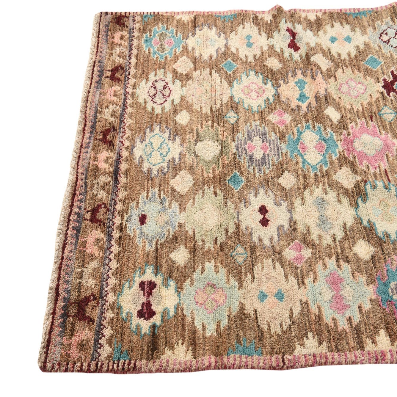 Primary color is Light Brown. Colors in this rug include: Light Brown, Beige, Blue, Brown, Purple, Turquoise, Pink, Tan, Ivory, Light Blue, Burgundy.