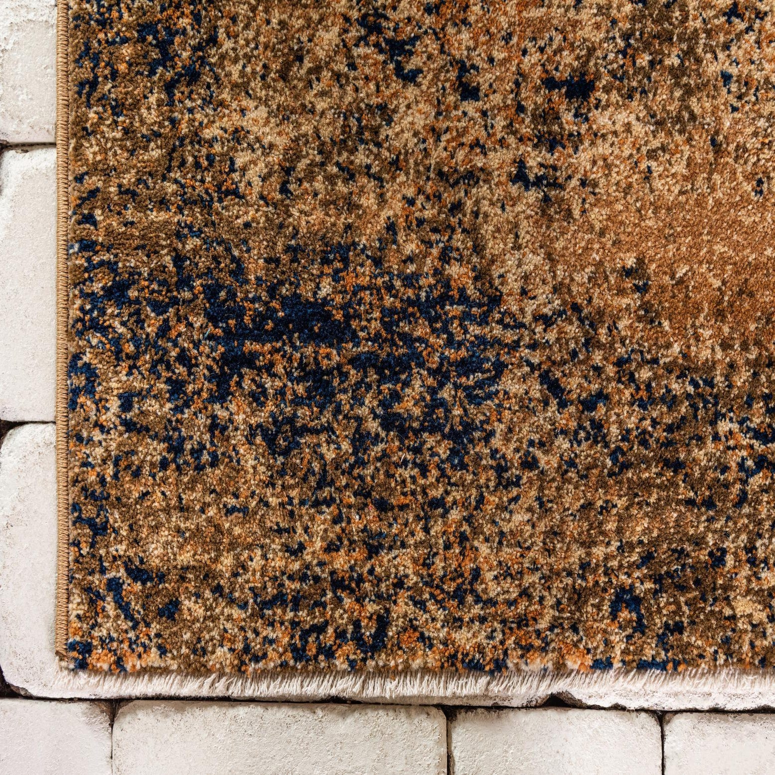 Primary color is Light Brown. Colors in this rug include: Light Brown, Ivory, Navy Blue, Tan.