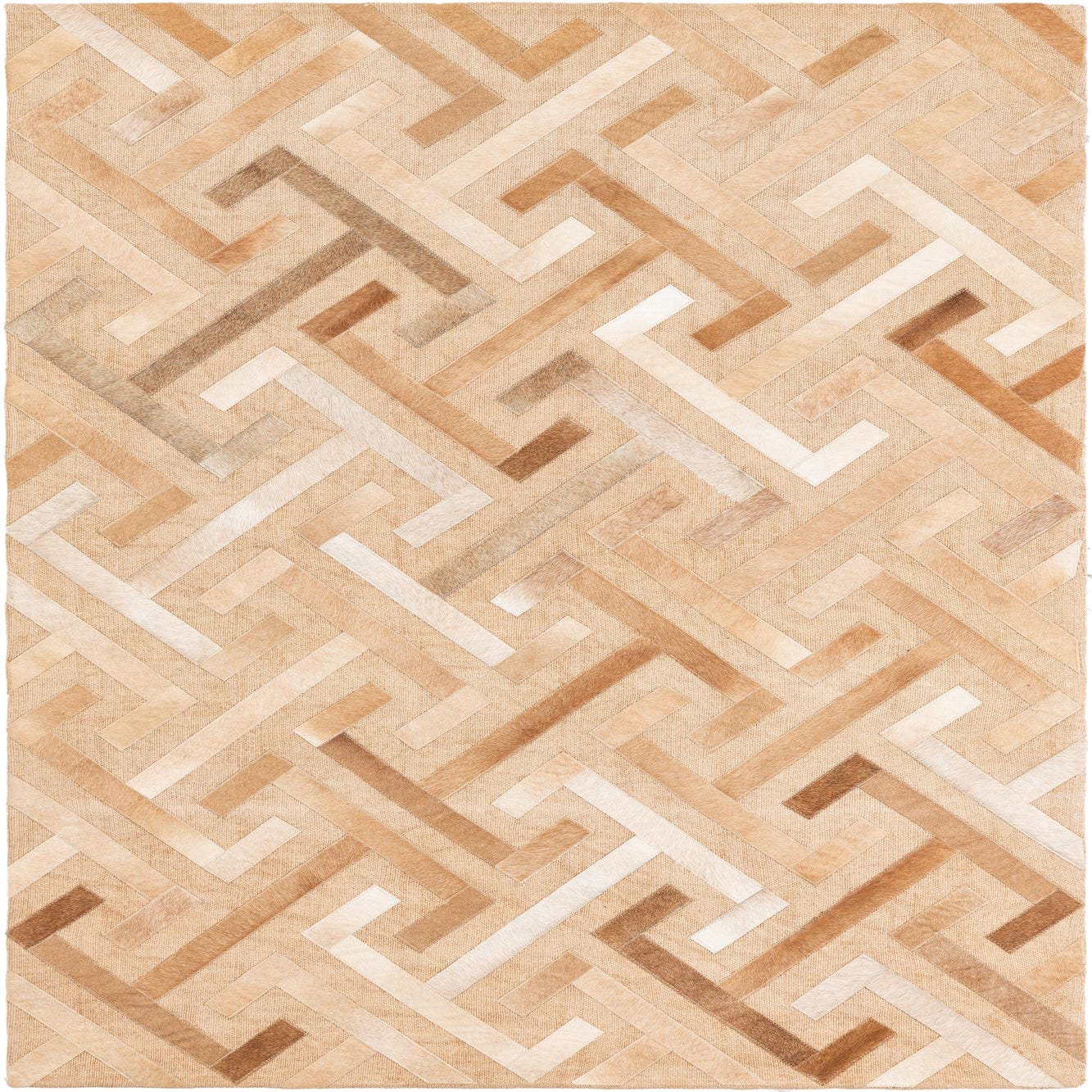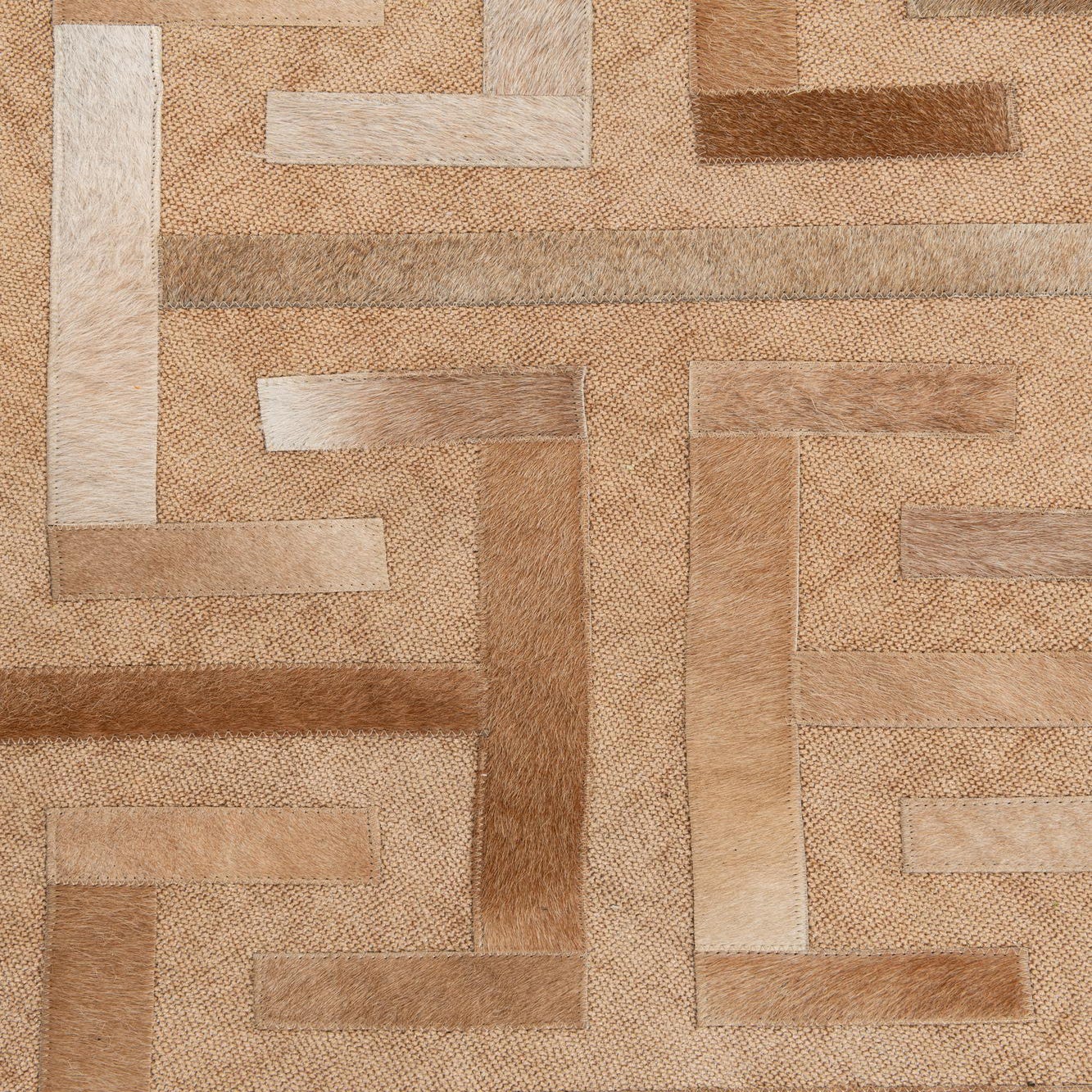 A 4x6 rectangular Cowhide Leather rug featuring a modern, abstract maze-like pattern in various shades of brown and tan.
