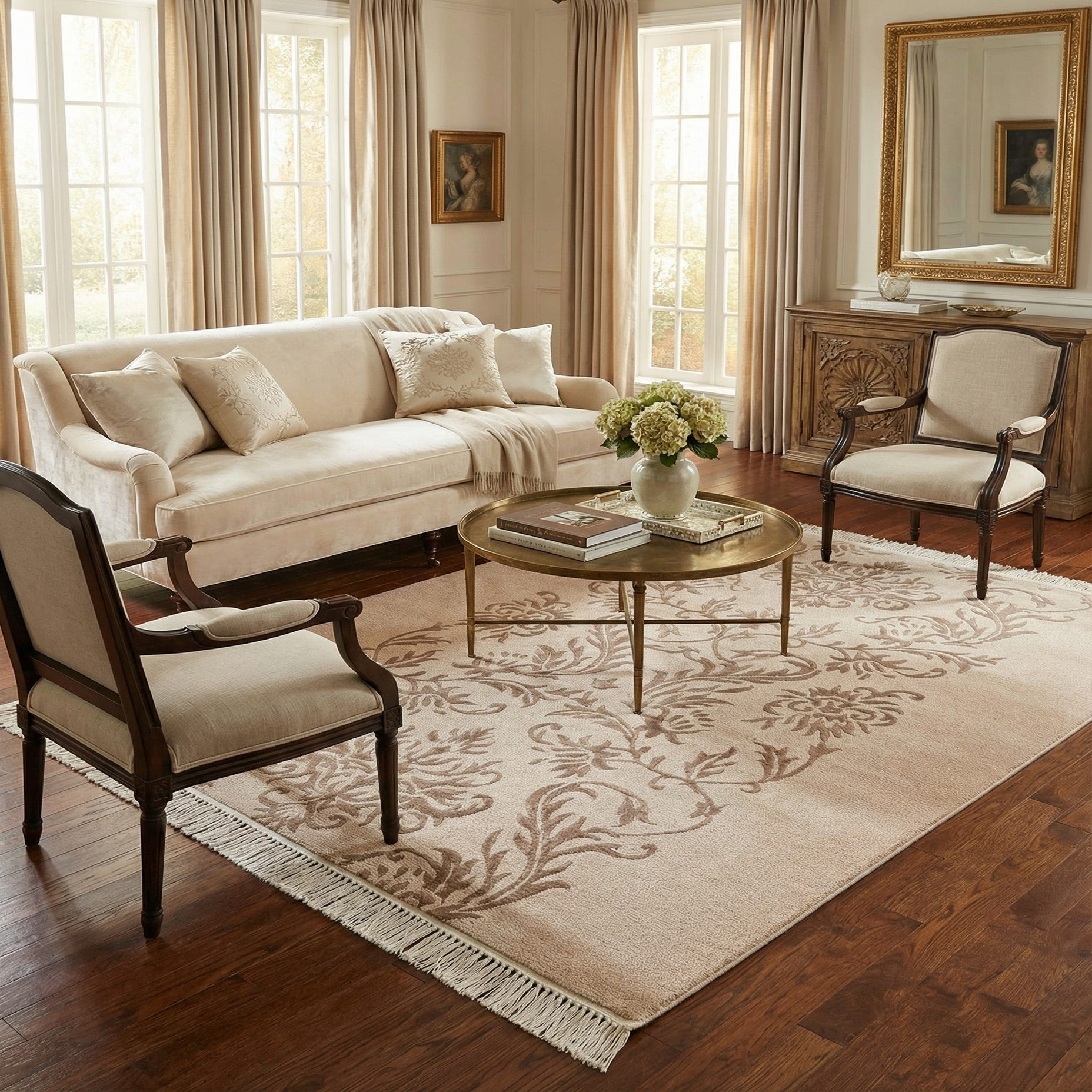 Given its classic pattern and neutral color scheme, this rug would be well-suited for traditional and transitional spaces alike. It would complement wooden furniture and natural tones, making it ideal for a living room, dining area, or bedroom that aims to evoke a sense of warmth and sophistication.
