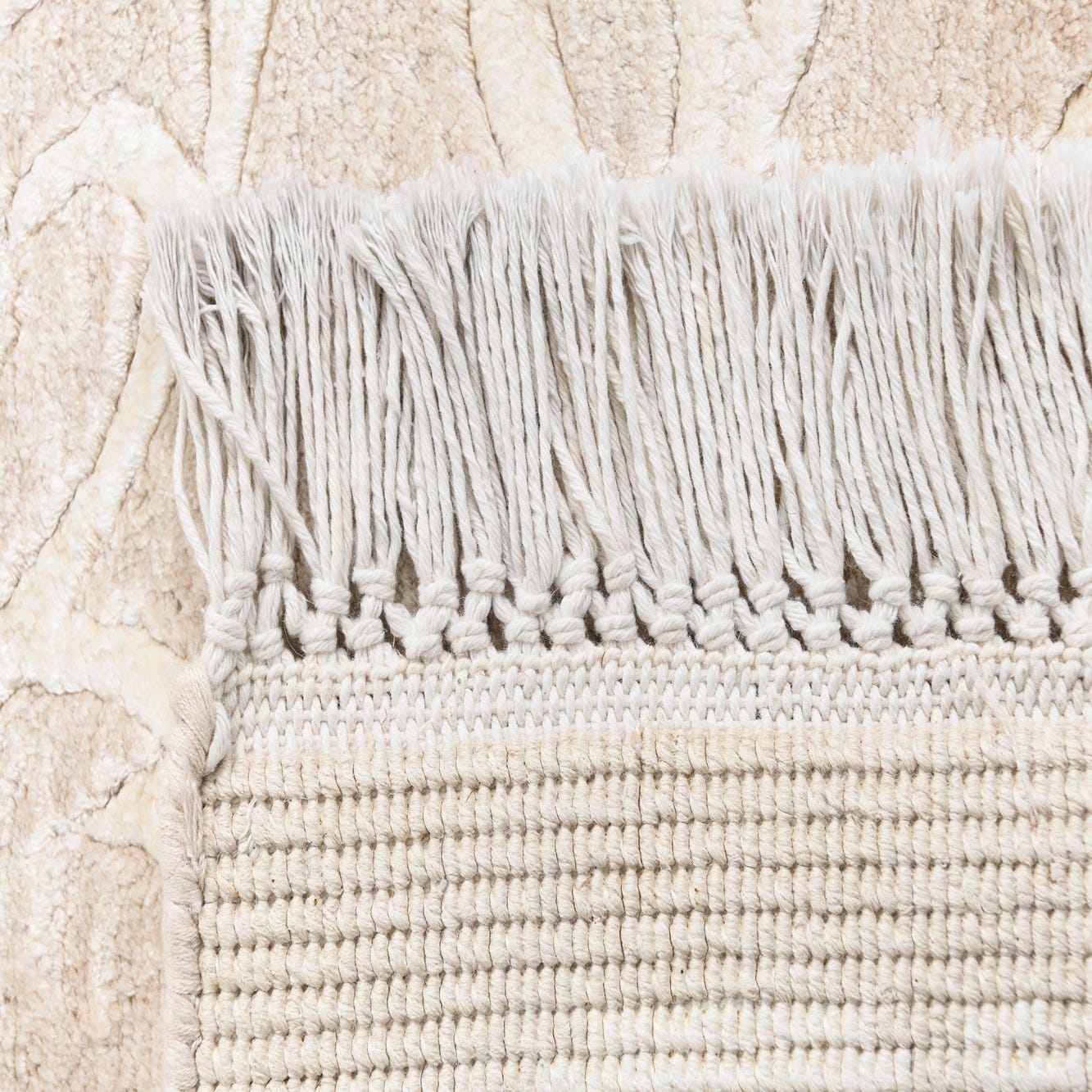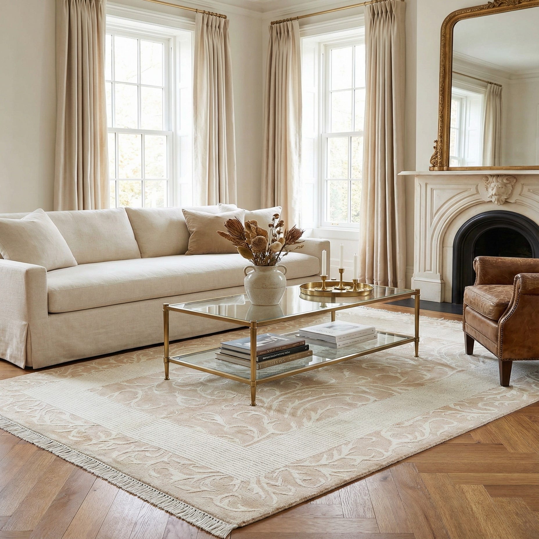 The soft, earthy tones and delicate pattern of this rug make it versatile for a variety of interior design scenarios. It is well-suited for spaces that aim for a sophisticated, understated aesthetic, such as contemporary living rooms, serene bedrooms, or polished office environments. The neutral color palette ensures it can integrate seamlessly into a range of color schemes, from monochromatic to more layered, eclectic decors. The wool-blend construction provides a comforting texture underfoot, making it a practical choice for areas where warmth and comfort are desired.