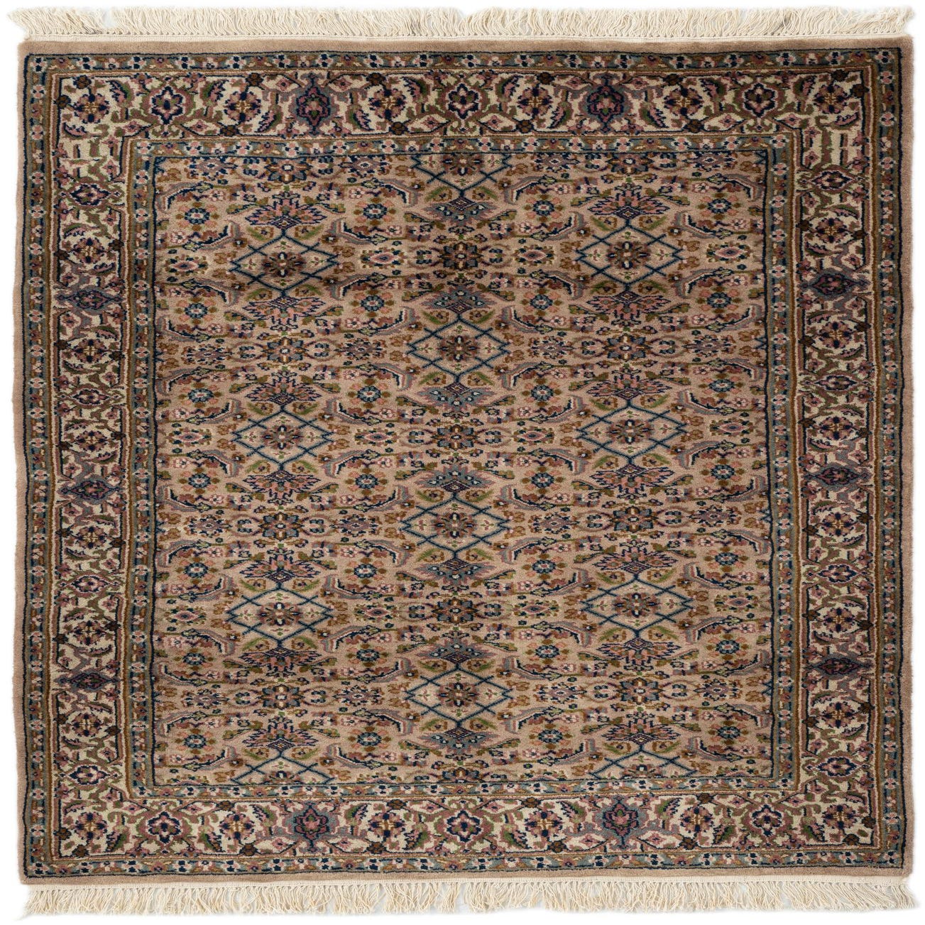 Hand-knotted in 100% wool, this rug presents a Persian-inspired layout of repeating diamond medallions and small floral rosettes set on a light brown ground. A narrow inner guard and a wider border of scrolling vines and palmette motifs frame the field, with accents in blue, light blue, pink and olive while brown tones provide depth and definition. The dense, finely knotted pile feels soft and slightly cushioned underfoot yet maintains a low-to-medium profile; finished fringes add a traditional touch.
