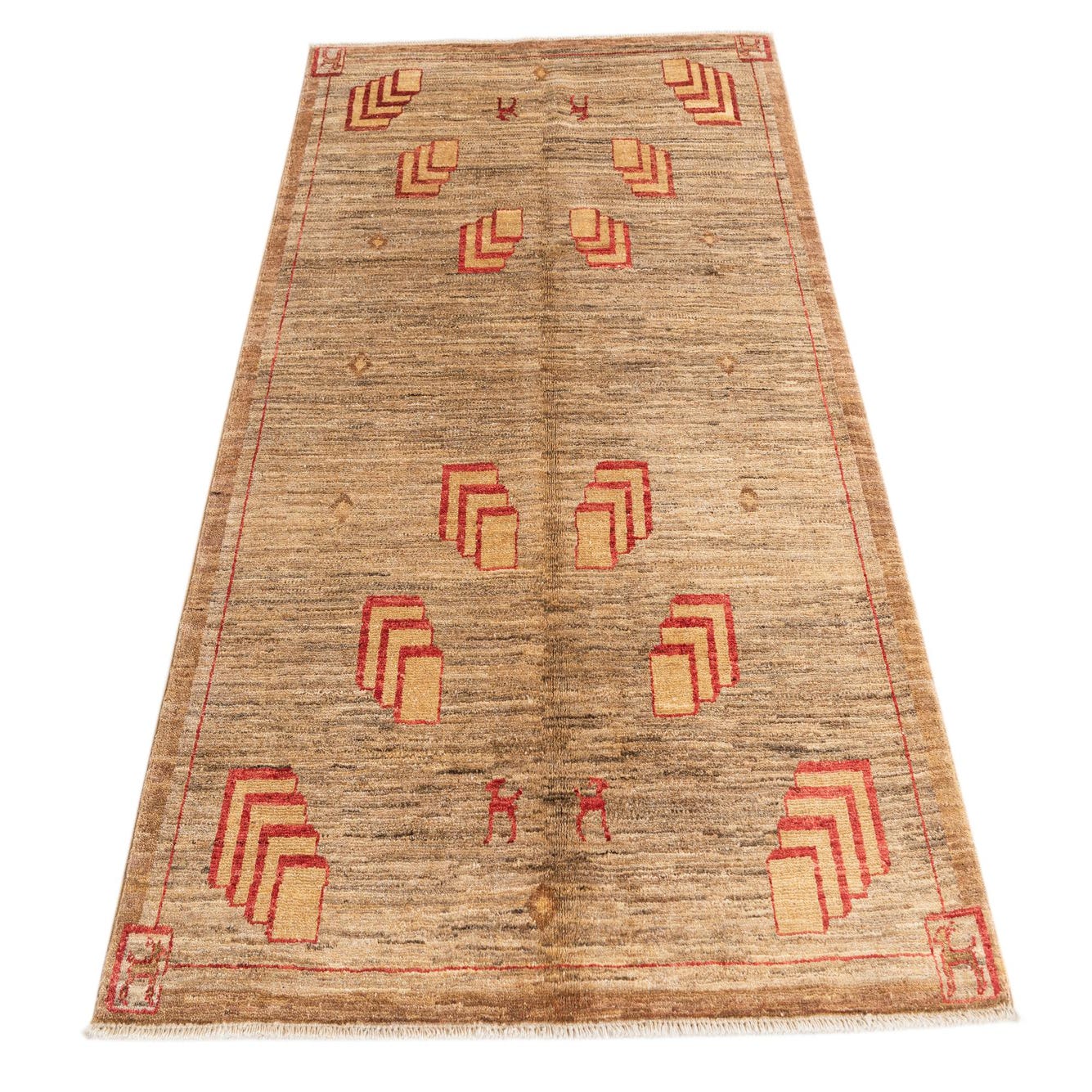 Primary color is Light Brown. Colors in this rug include: Light Brown, Beige, Brown, Gold, Red.
