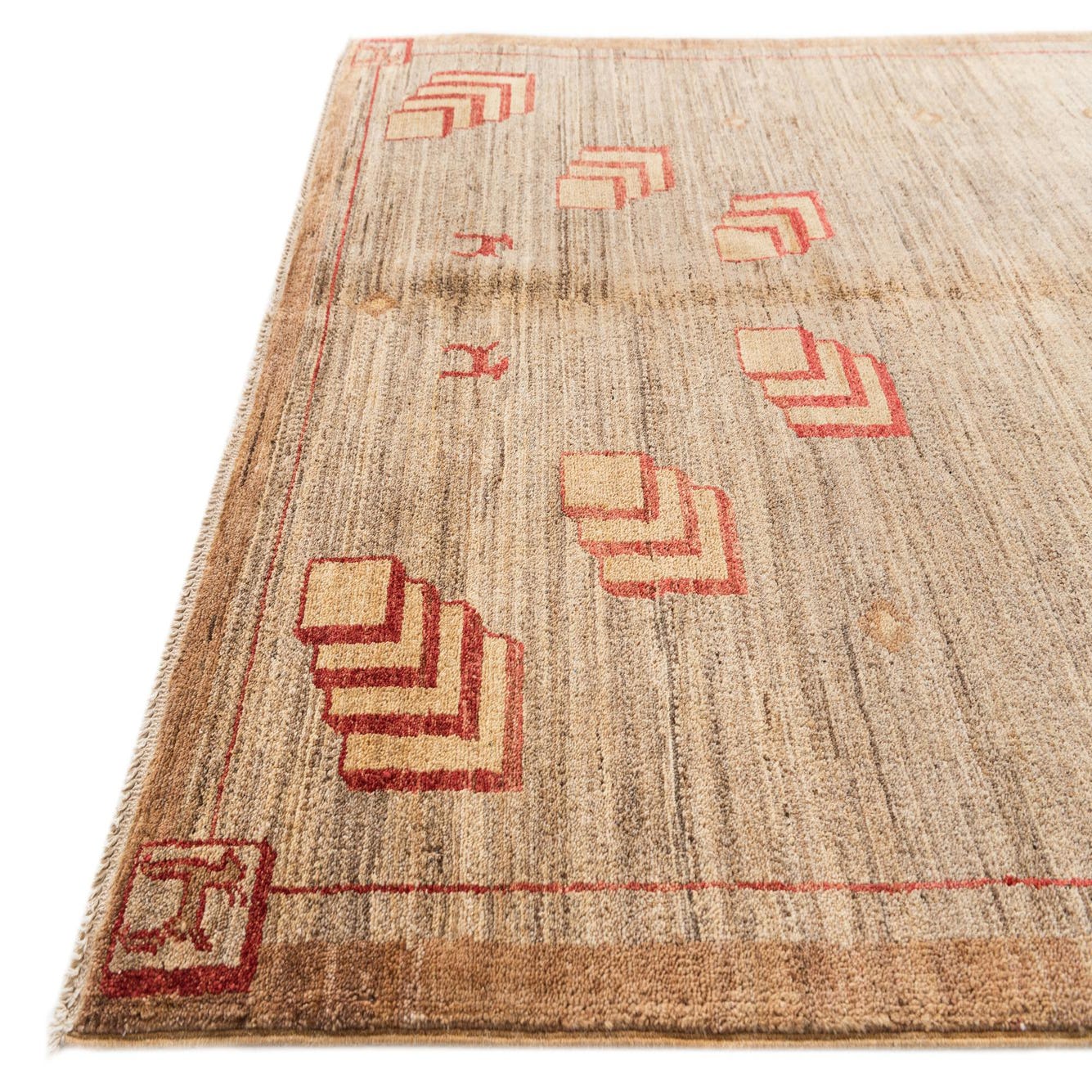 This Modern Ziegler rug features an understated elegance with a harmonious blend of Light Brown, Beige, Brown, Gold, and Red hues on a Light Brown background, accompanied by a pattern of geometric motifs and linear accents. The rug is hand-knotted from 100% hand-spun wool, contributing to its durability and textural appeal, while the presence of fringe adds a classic touch to its 4x6 dimensions.