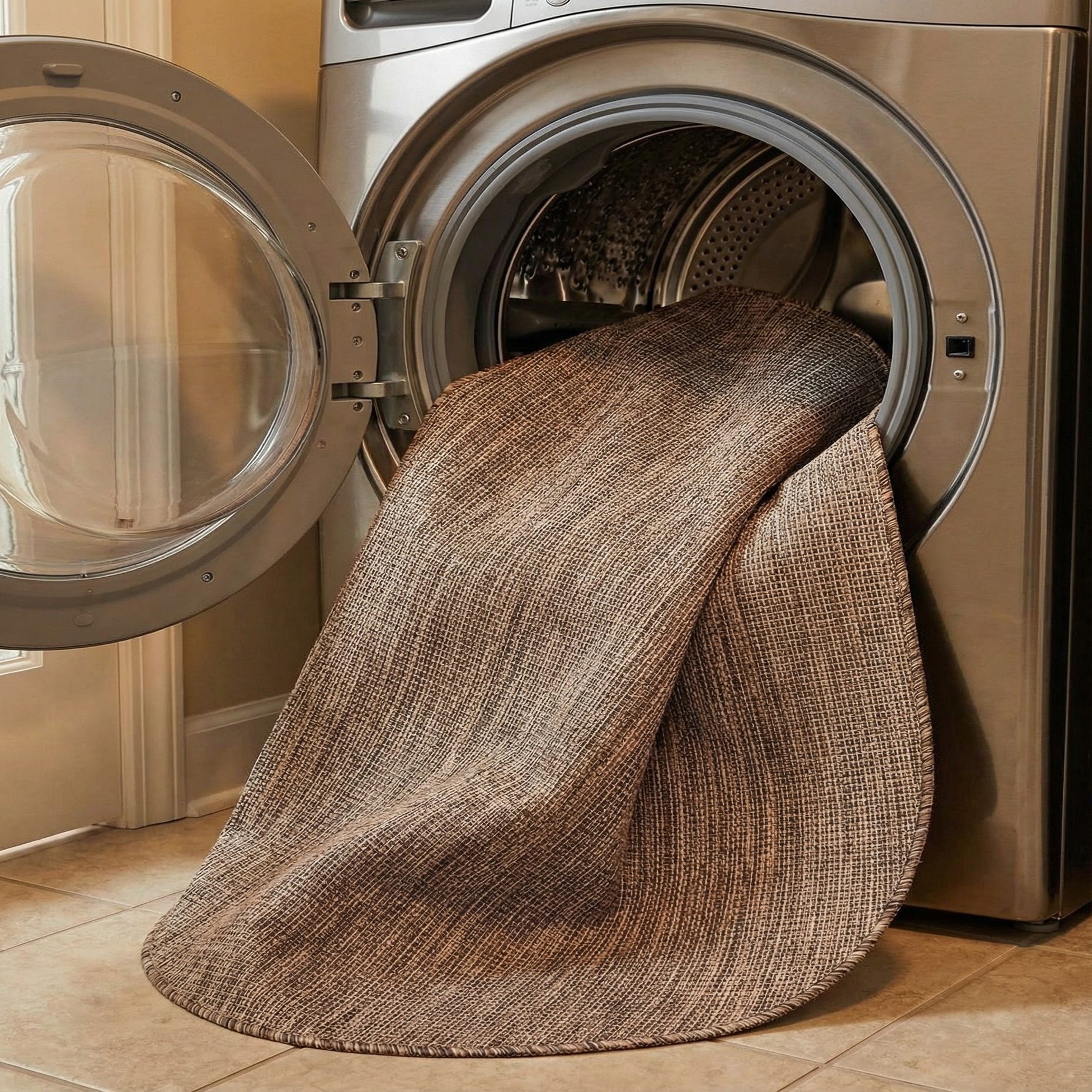Neutral tones and a restrained pattern make this piece well-suited for covered patios, sunrooms, entryways, or layered beneath round or oval dining furniture to reinforce soft geometric lines. It pairs naturally with natural wood, wicker, matte metal frames, and linen upholstery; add textured throw pillows or a simple patterned runner for contrast when placing it in a casual living room or coastal-inspired porch.