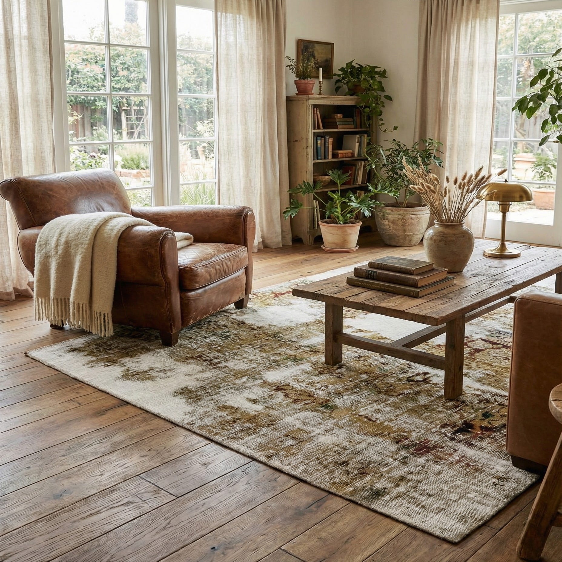 A 4x6 rectangular Ultra Vintage rug featuring a distressed Persian pattern in browns, tans, and hints of blue, with areas of faded white.
