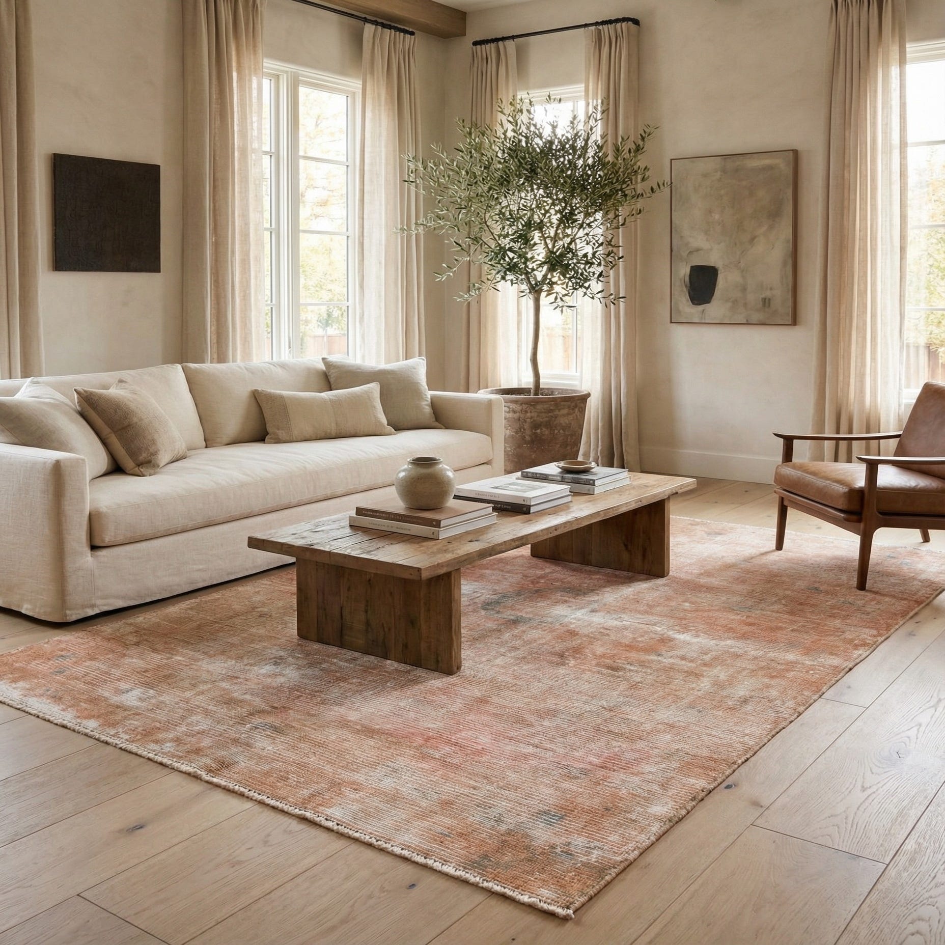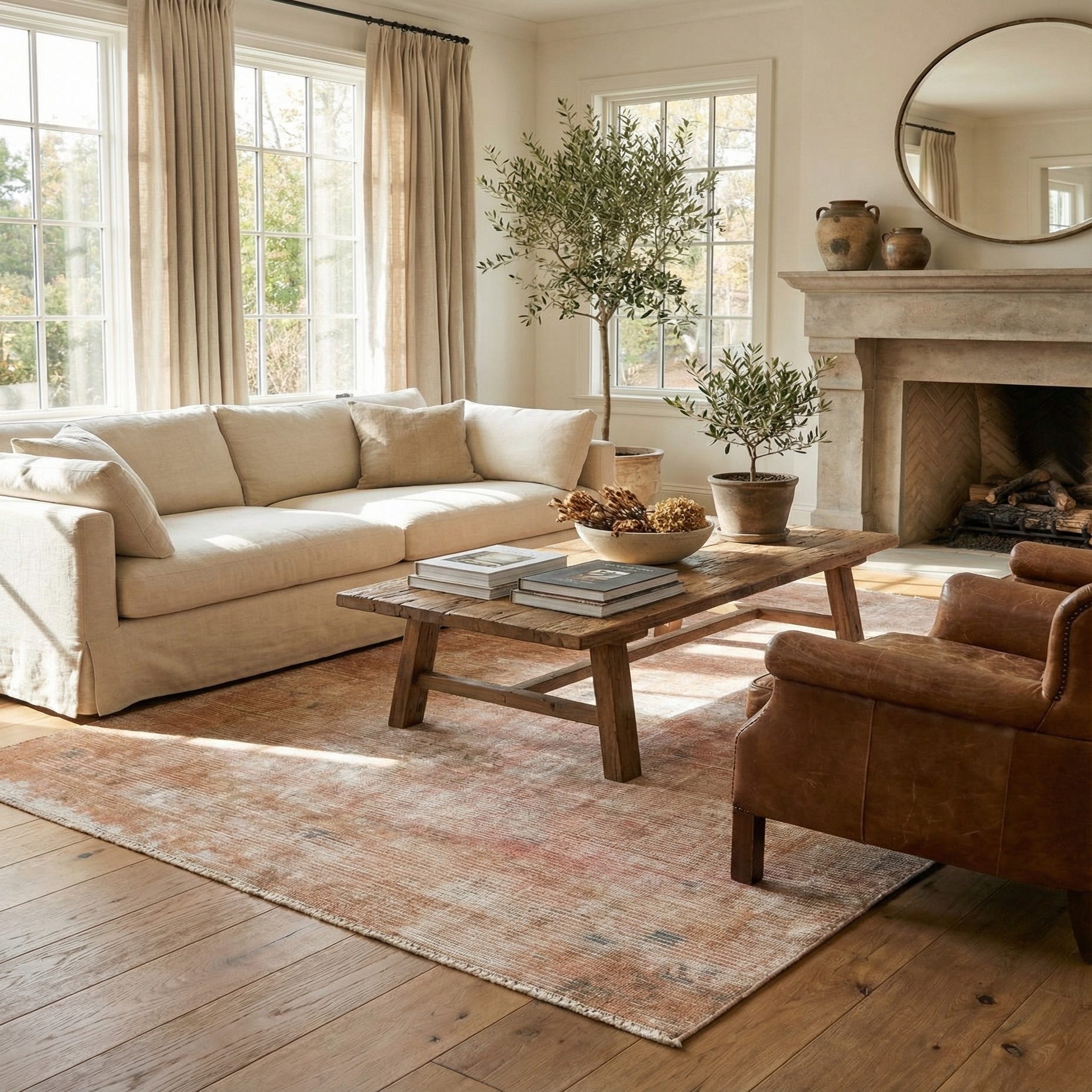 This rug would be well-suited to a variety of decor settings. The subdued colors and vintage pattern make it a versatile option for spaces with an antique or rustic vibe, yet it could equally serve as a counterpoint in a more contemporary room where it would add warmth and textural interest. In either traditional or modern environments, this piece could serve as a sophisticated foundation in living rooms, studies, or bedrooms where its artisanal qualities and gentle hues would complement a range of furniture and decorative accents.