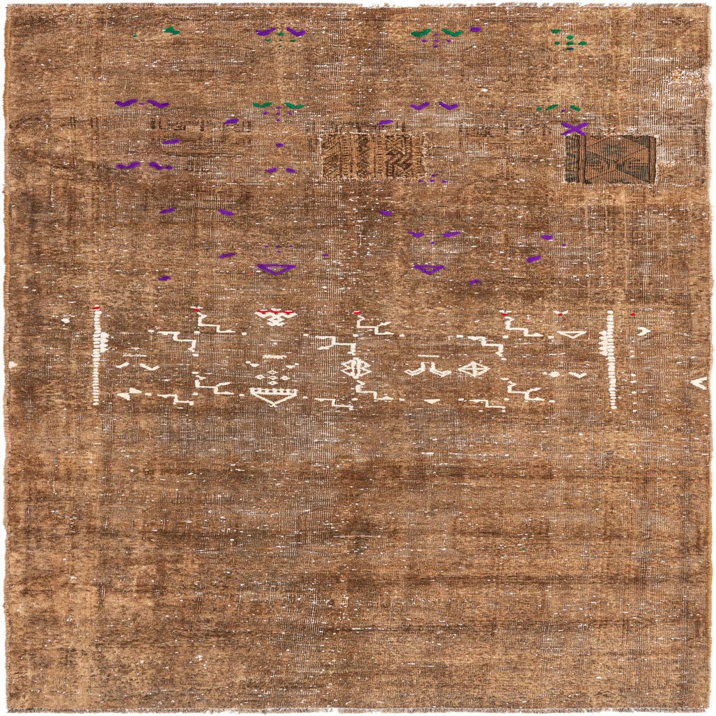 A 4x6 rectangular brown and tan wool rug with a distressed Persian-inspired pattern and colorful accents.