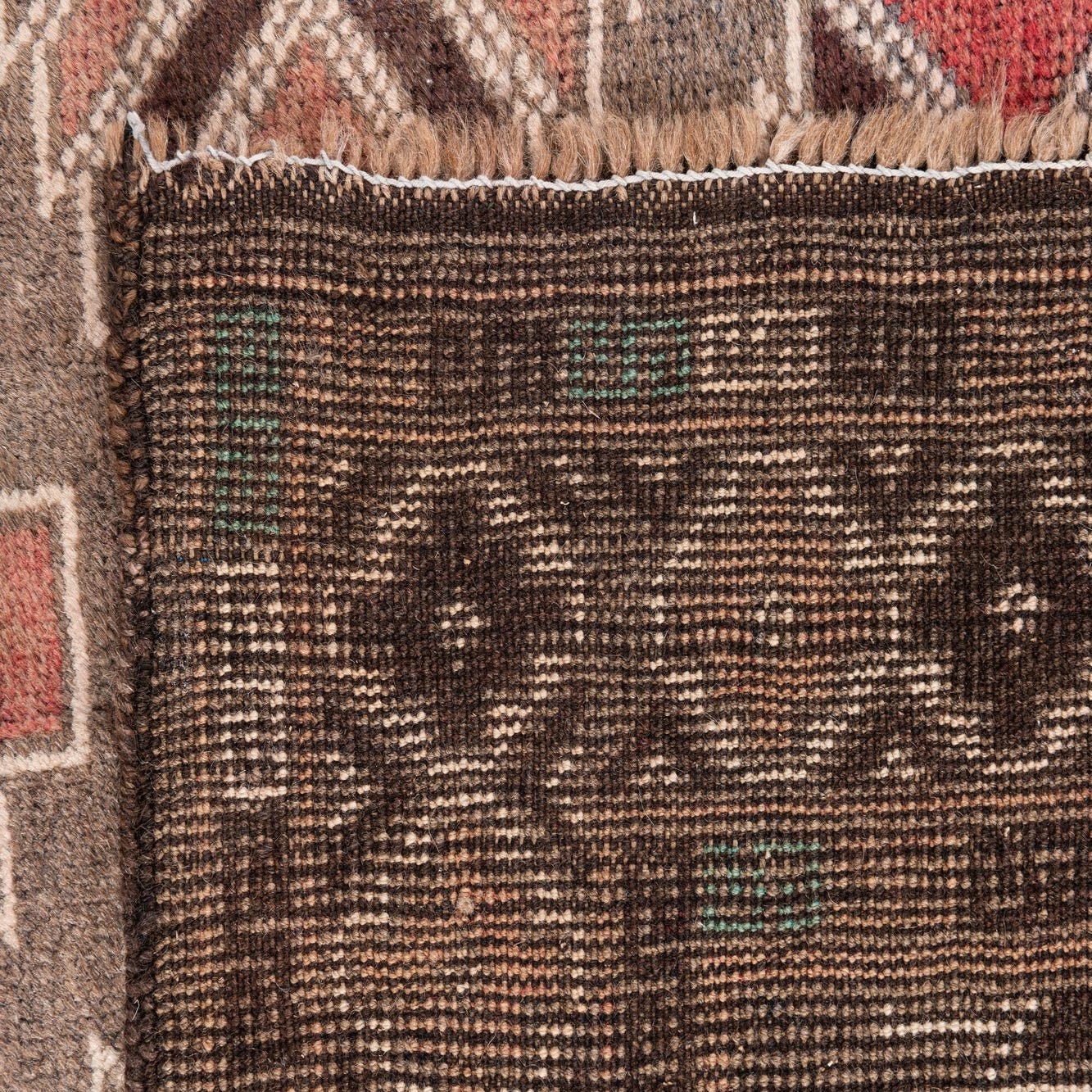 Primary color is Light Brown. Colors in this rug include: Light Brown, Brown, Green, Ivory, Pink, Rust Red, Burgundy.