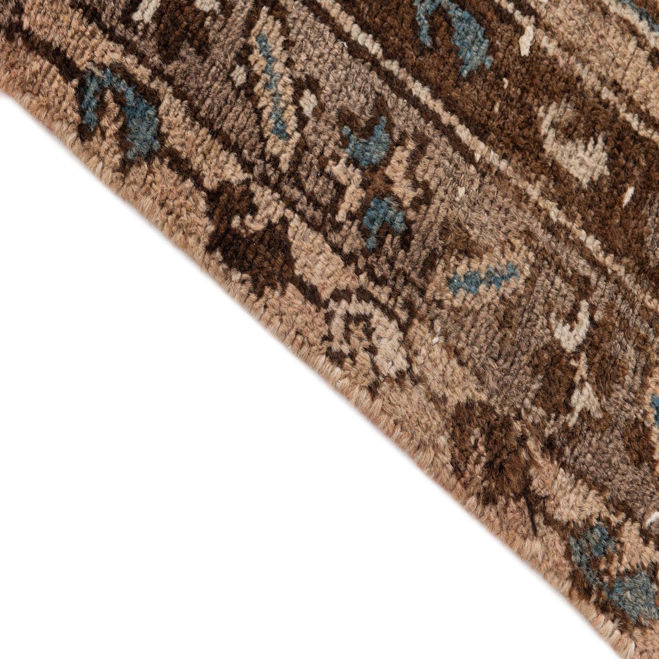 This 4x6 Ultra Vintage collection rug is a testament to the timeless art of hand-knotted craftsmanship, made of 100% wool for a durable and plush feel underfoot. The rug displays a central medallion pattern complemented by intricate geometrical and botanical motifs. The color palette is grounded in a light brown background with accents of brown, navy blue, and ivory, providing a versatile range of hues that can harmonize with various design elements.
