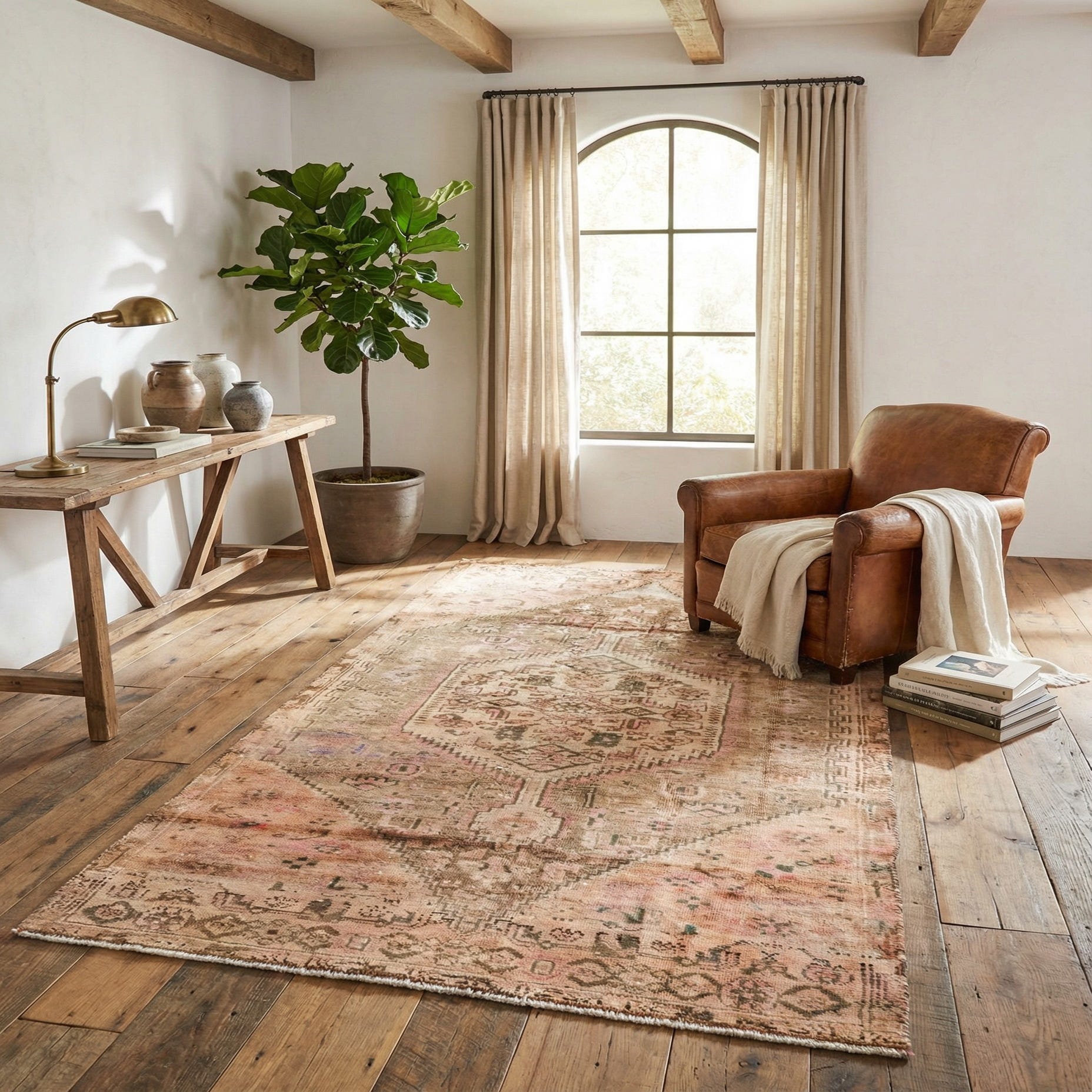 Primary color is Light Brown. Colors in this rug include: Light Brown, Brown, Ivory, Rust Red, Peach.