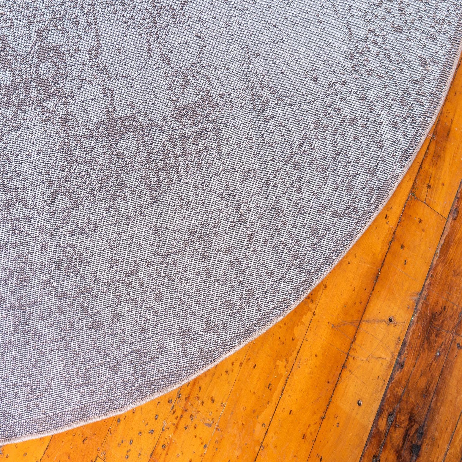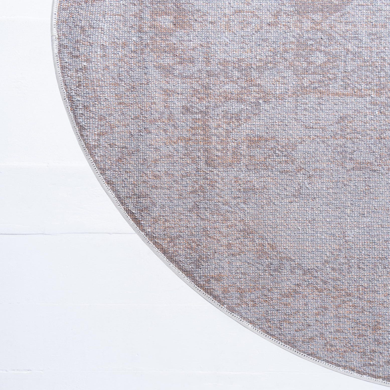 Round, low-profile machine-made rug crafted from 100% polypropylene. A light brown background carries a softly distressed medallion pattern in beige and ivory, where traditional motifs are intentionally faded to create a vintage-inspired, lived-in look. The pile is low and dense, offering a smooth, slightly cushioned feel underfoot that sits flat beneath furniture and highlights the rug’s subtle tonal variations.
