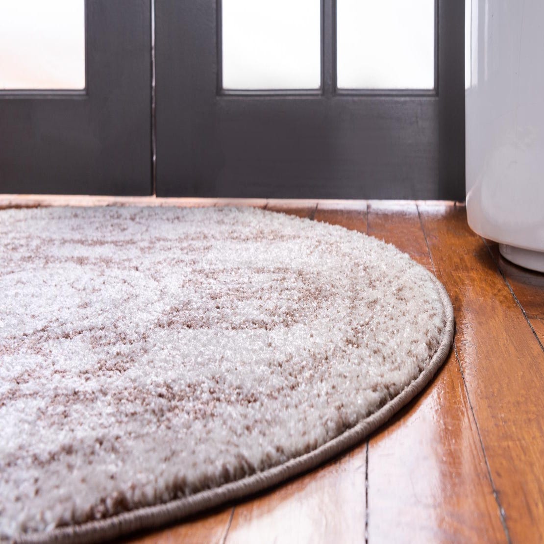 A 5' 0 x 5' 0 round brown and tan shabby-chic rug with a distressed medallion pattern.