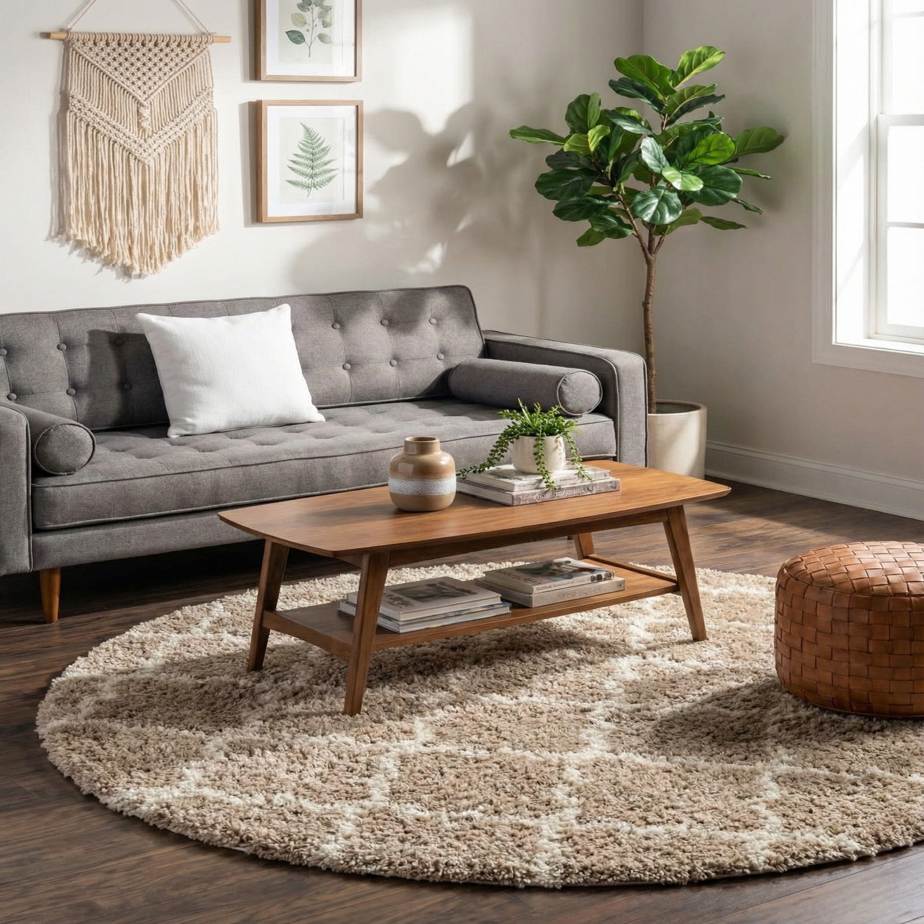 This rug works well in casual and transitional interiors — place it beneath a round coffee table in a living room, anchor a cozy reading nook, or add warmth to a bedroom seating area. Its neutral palette also pairs easily with coastal, farmhouse, and modern-bohemian schemes, and it layers nicely over a larger floor covering to introduce softness and pattern.