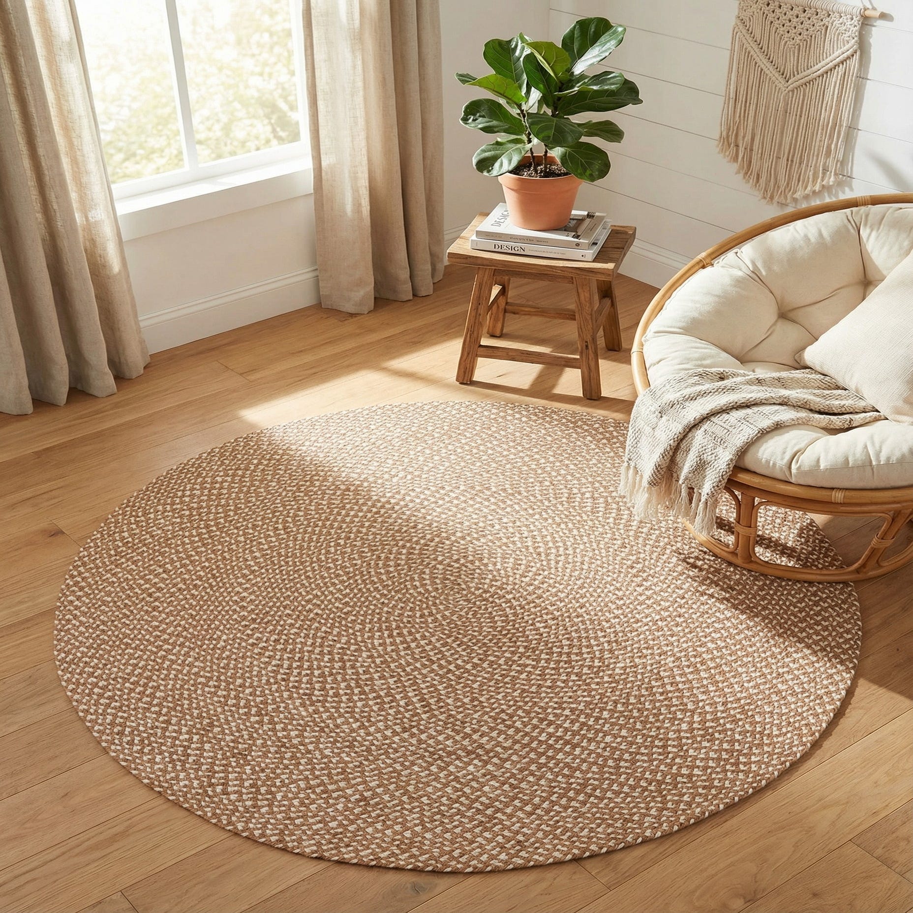 This rug works well in casual, layered interiors such as coastal, farmhouse, or relaxed Scandinavian schemes. Place it under a round dining table or bistro set, layer it beneath a seating group to add grounding texture on hardwood floors, or tuck it into a sunroom, entry, or reading nook to soften the space. It pairs nicely with rattan and wood furniture, linen upholstery, and neutral palettes where its light brown and ivory tones can complement warm woods and woven accents.