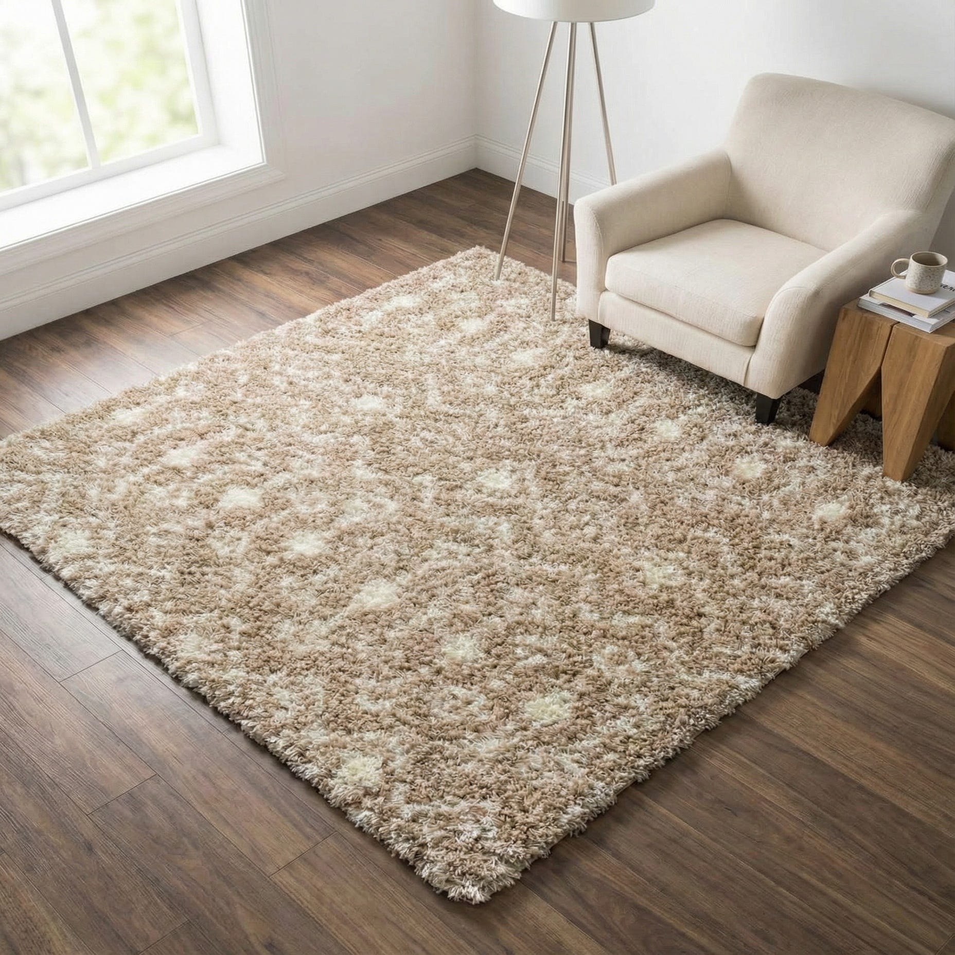 A rich, high-pile shag in a warm light brown background is layered with an ivory trellis motif that rests just above the pile, creating a soft, subtle pattern you can both see and feel. The long, plush fibers offer a cushioned, springy underfoot texture while the ivory highlights add gentle contrast without overpowering the neutral base. Machine made from 100% polypropylene, the construction produces a consistent, even pile with a soft hand and a low-key sheen that complements natural materials.