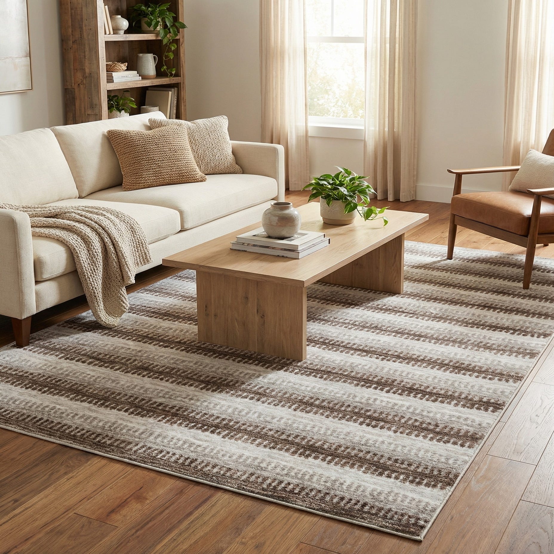 Machine-made from 100% polypropylene, the rug has a low-to-medium pile with a soft, slightly cushioned hand; slight pile variation along the stripes adds a gentle, textured feel you can notice beneath your feet. Its neutral, modern-leaning design works well under a living room seating area or coffee table, layered at the foot of a bed, or placed in a home office to introduce pattern without overwhelming the space. This rug complements wood and leather pieces, linen upholstery, and a calm, contemporary or casually traditional décor.