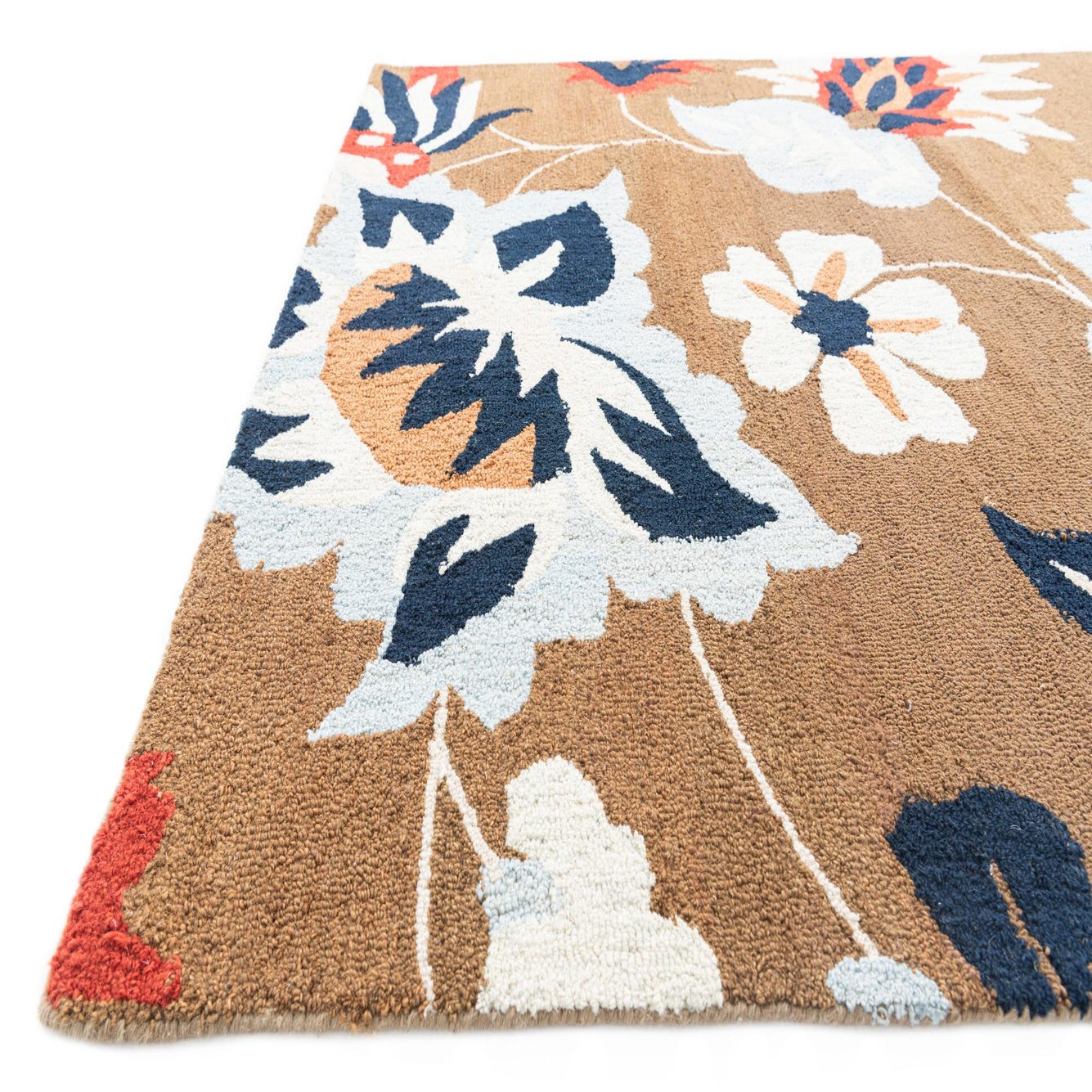 A 5x8 rectangular brown area rug with a modern floral pattern in navy, light blue, white, and rust.