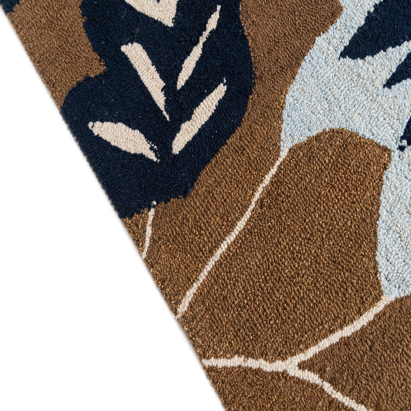 Hand-tufted in wool and cotton, this rug sits on a light brown ground that warms a room while anchoring a bold floral pattern. Oversized blooms and leaves are rendered in light blue, navy blue, ivory, red and gray, with navy accents and red pops that give the design clear contrast and movement. The hand-tufted pile creates a soft, slightly plush surface where the wool fibers hold shape and the cotton base gives subtle structure, so each petal and leaf edge feels defined underfoot.