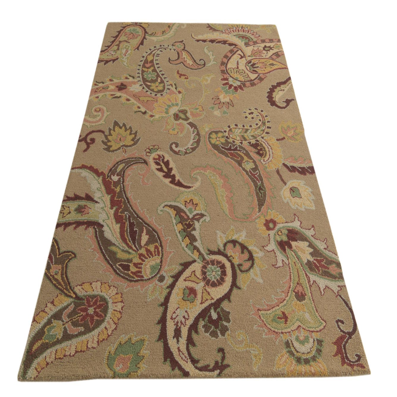 The Agra collection presents a hand-tufted rug that offers a harmonic combination of light brown, olive, peach, rust red, yellow, gray, and green hues on a welcoming light brown background. Spanning 5x8 feet, this piece is crafted from 100% wool, ensuring a dense and plush feel underfoot.