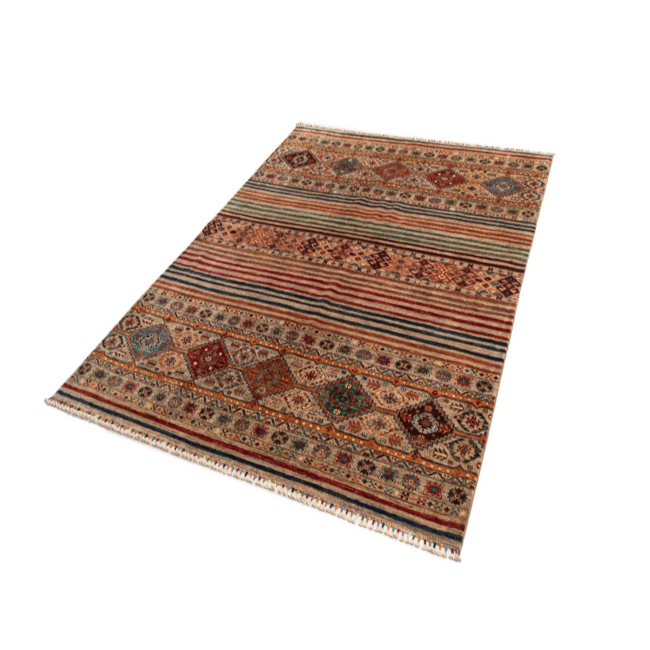 The Ariana Ziegler Collection presents a 5x8 hand-made rug crafted from 100% wool, providing a tactile pleasure underfoot and a premium aesthetic. This particular piece features a light brown background that is adeptly complemented by a diverse palette that includes orange, blue, red, burgundy, and brown. The pattern is an intricate combination of geometric motifs and stripes that create a dynamic visual landscape across the rug's surface. The texture is enriched by the high-quality wool, lending a sense of warmth and comfort to any room.