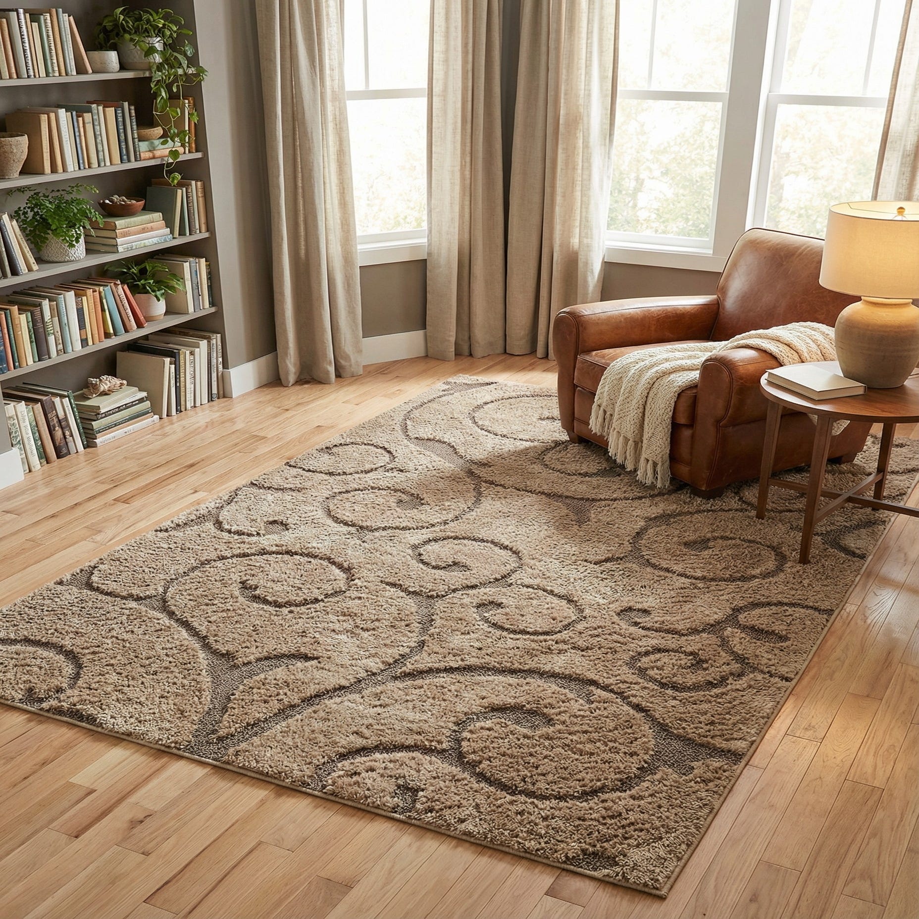 Run your hand across the surface and you’ll notice the deep, cushiony pile underfoot balanced by the firmer loops that outline the pattern. The neutral brown tones pair well with natural wood floors, cream or taupe upholstery, and layered textiles; place it in a living room beneath a coffee table, at the foot of a bed to add warmth, or anchor a cozy reading nook. Its organic motif and soft texture suit transitional, casual-traditional, and contemporary interiors that favor warm, neutral palettes.