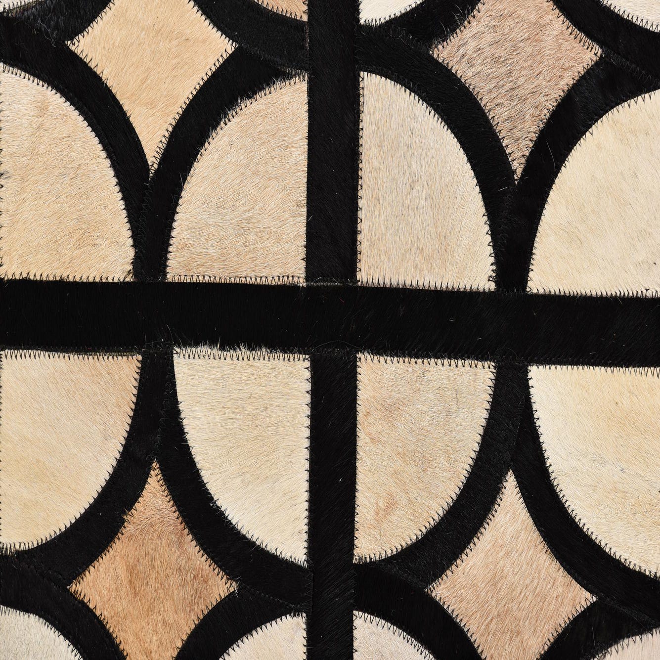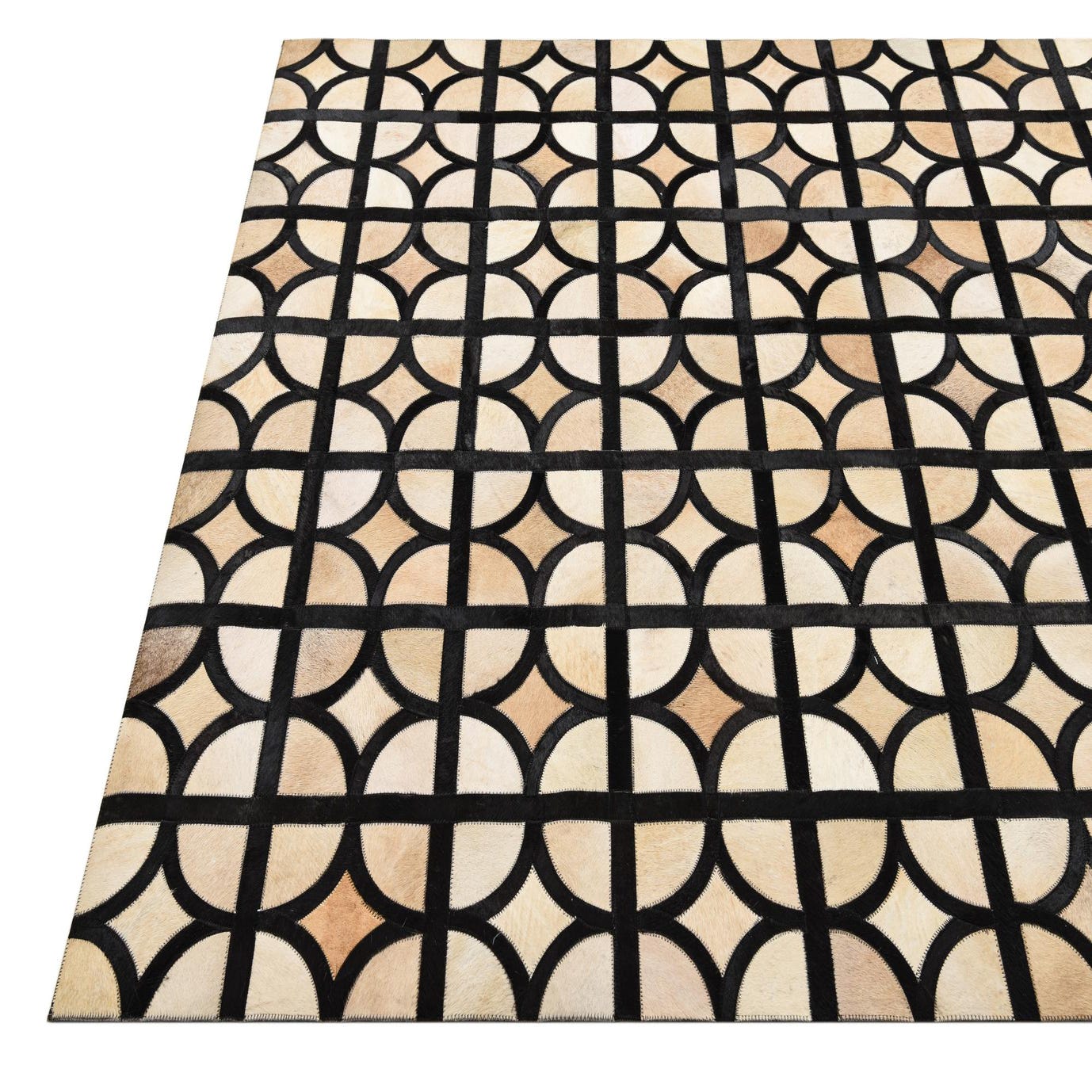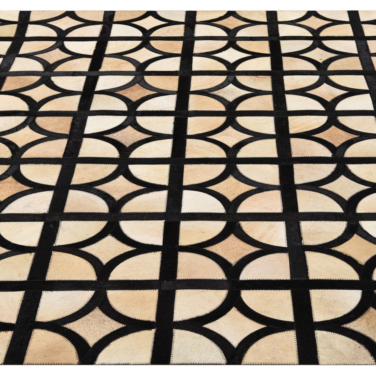 A 5x8 rectangular cowhide rug featuring a modern geometric pattern of tan and brown semicircles and quarter circles outlined by dark leather strips.