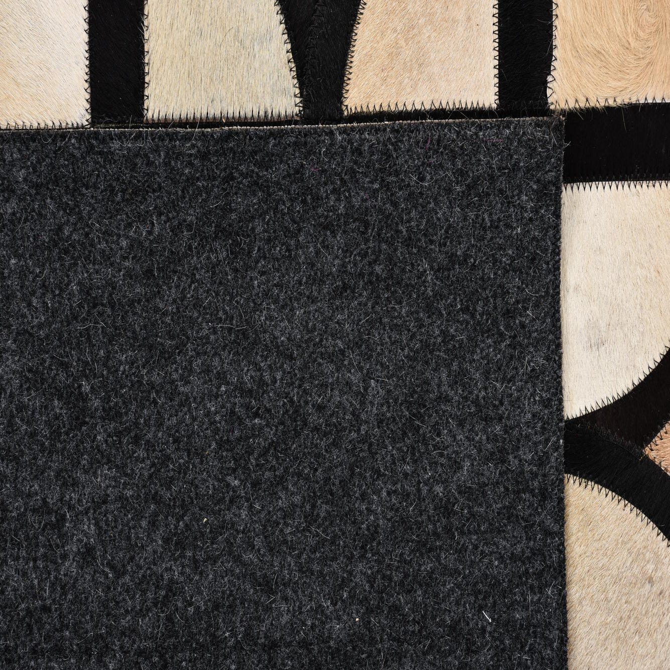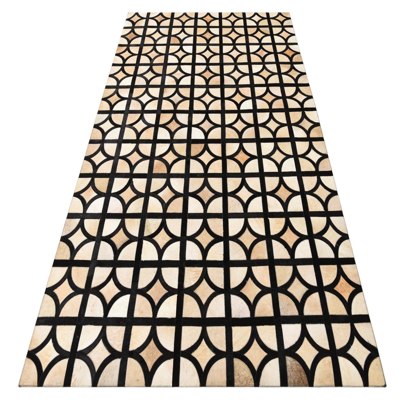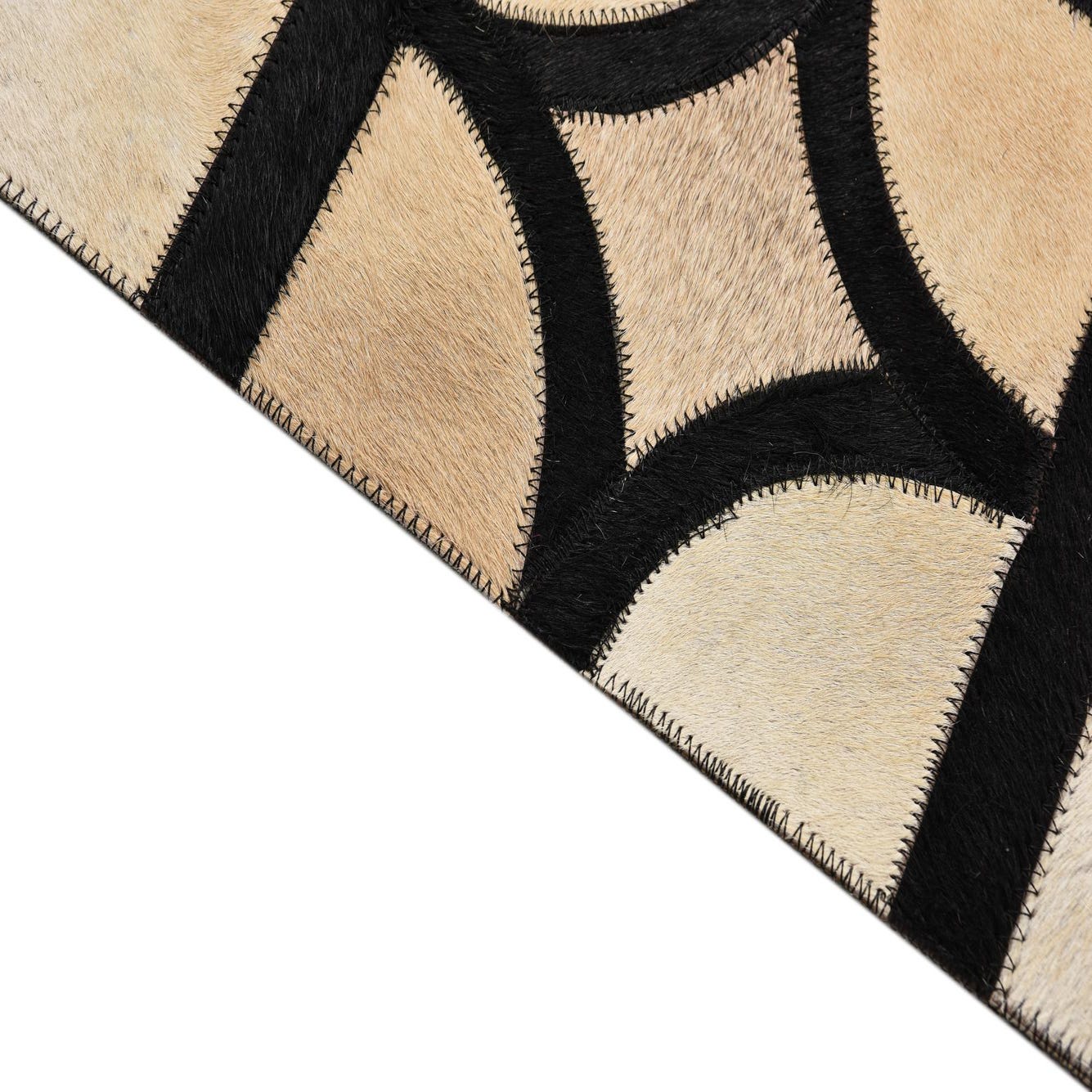 A 5x8 rectangular cowhide rug featuring a modern geometric pattern of tan and brown semicircles and quarter circles outlined by dark leather strips.