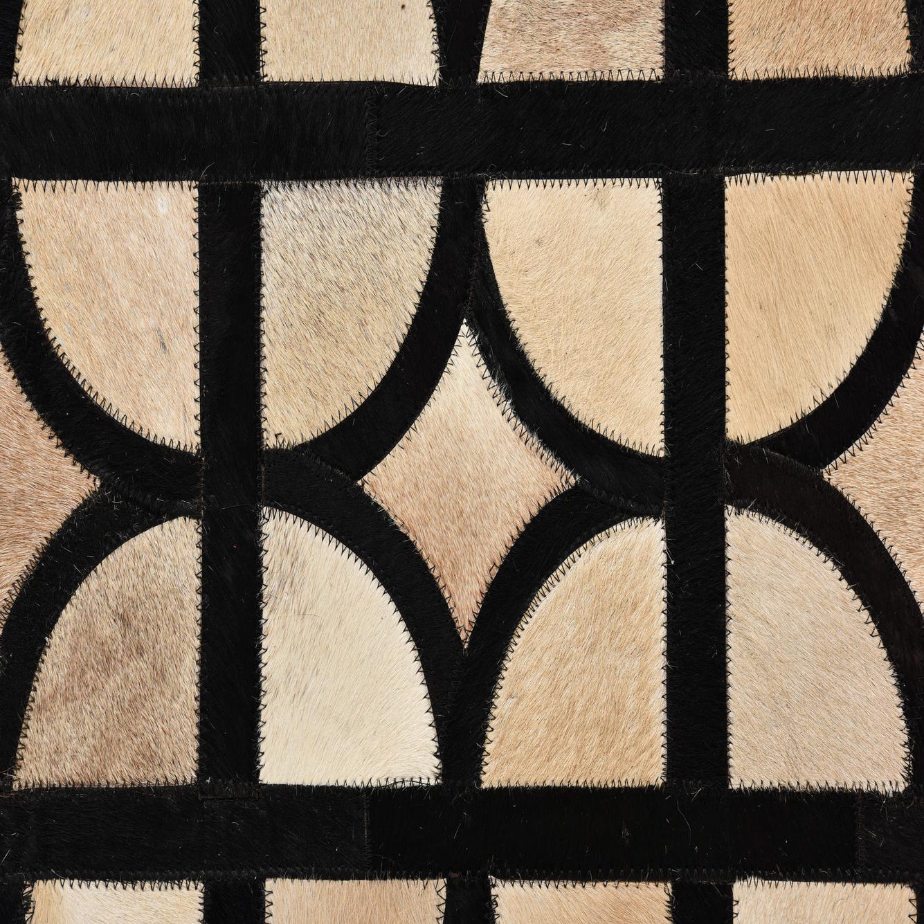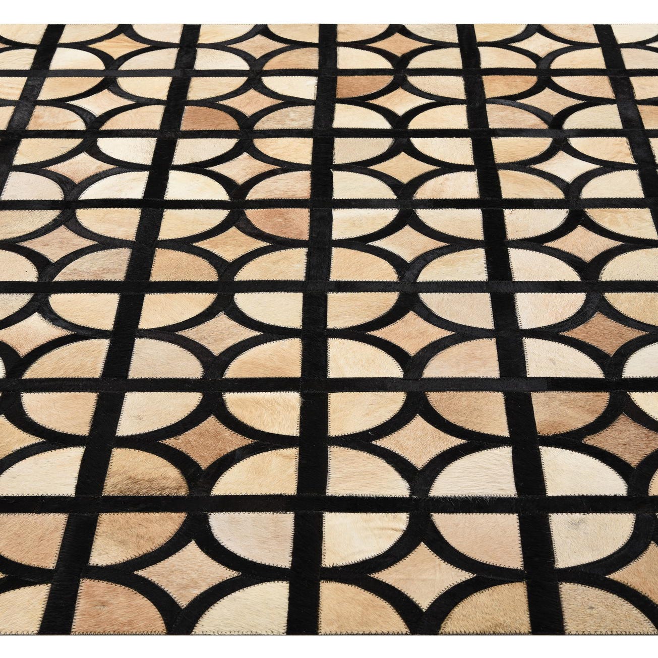 A 5x8 rectangular Cowhide rug featuring a modern geometric pattern of tan and brown semicircles and quarter circles outlined by black leather strips.