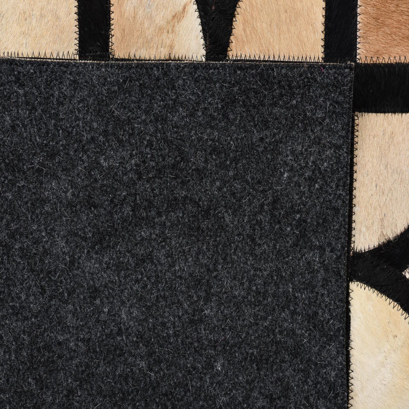The rich texture of the cowhide and leather imparts a tactile dimension that is both luxurious and inviting. The combination of natural materials and the meticulous handcrafted construction ensures that each rug is unique, with subtle variations that add to its distinct character.