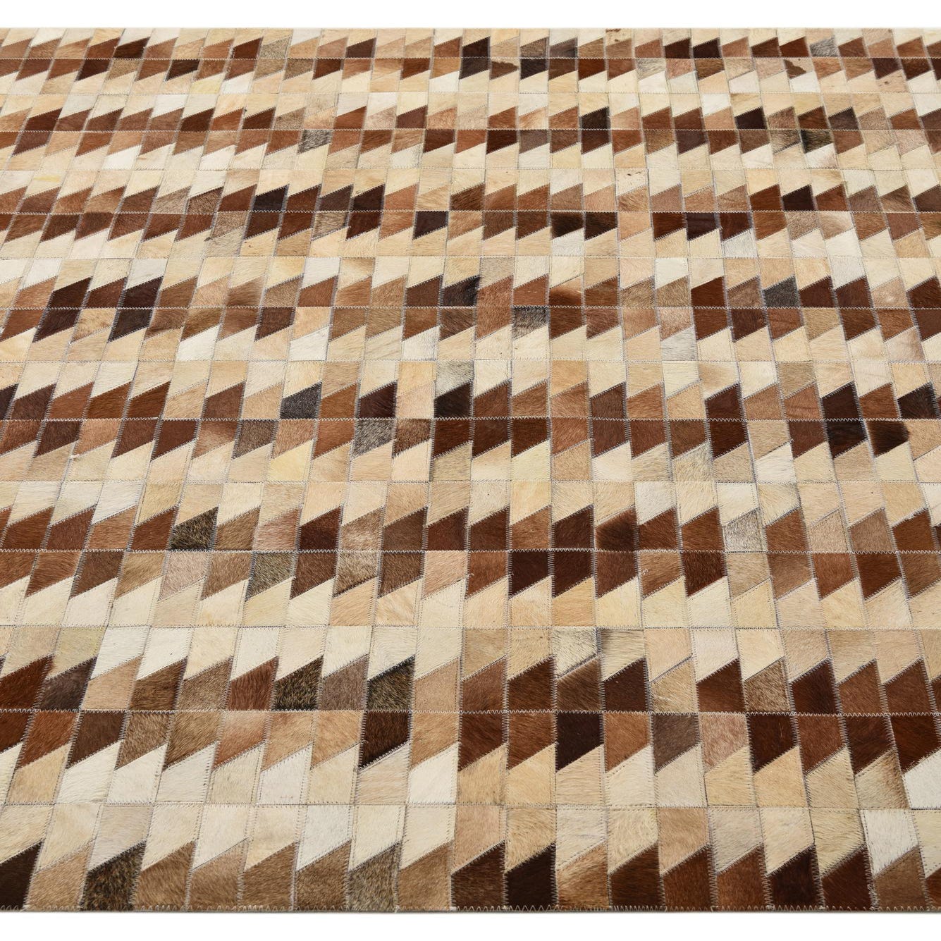 A 5x8 rectangular Cowhide rug featuring a modern geometric pattern of alternating brown and tan parallelogram patches.