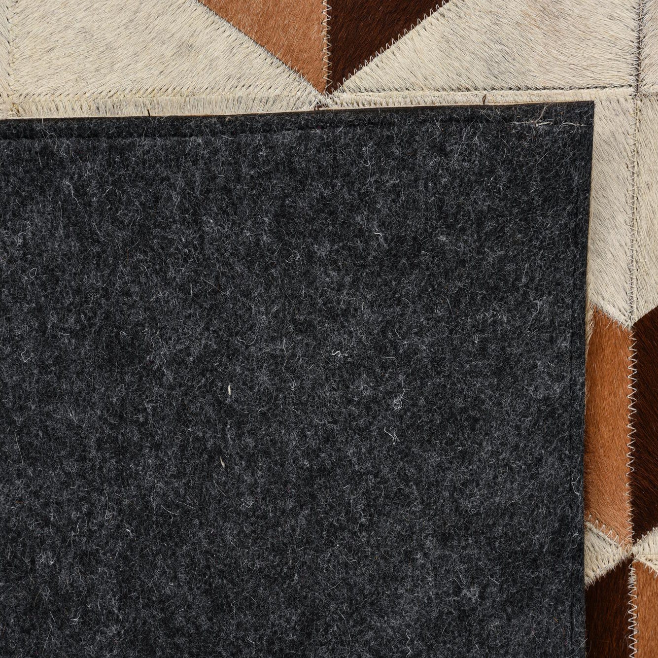 Hand made of cowhide and leather, this rug brings an organic edge to contemporary and transitional interiors. Place it beneath a living room seating group to anchor mid-century or modern furnishings, layer it in a rustic or modern farmhouse den for contrast with wood tones, or use it in a home office or entry for refined texture that still feels grounded.